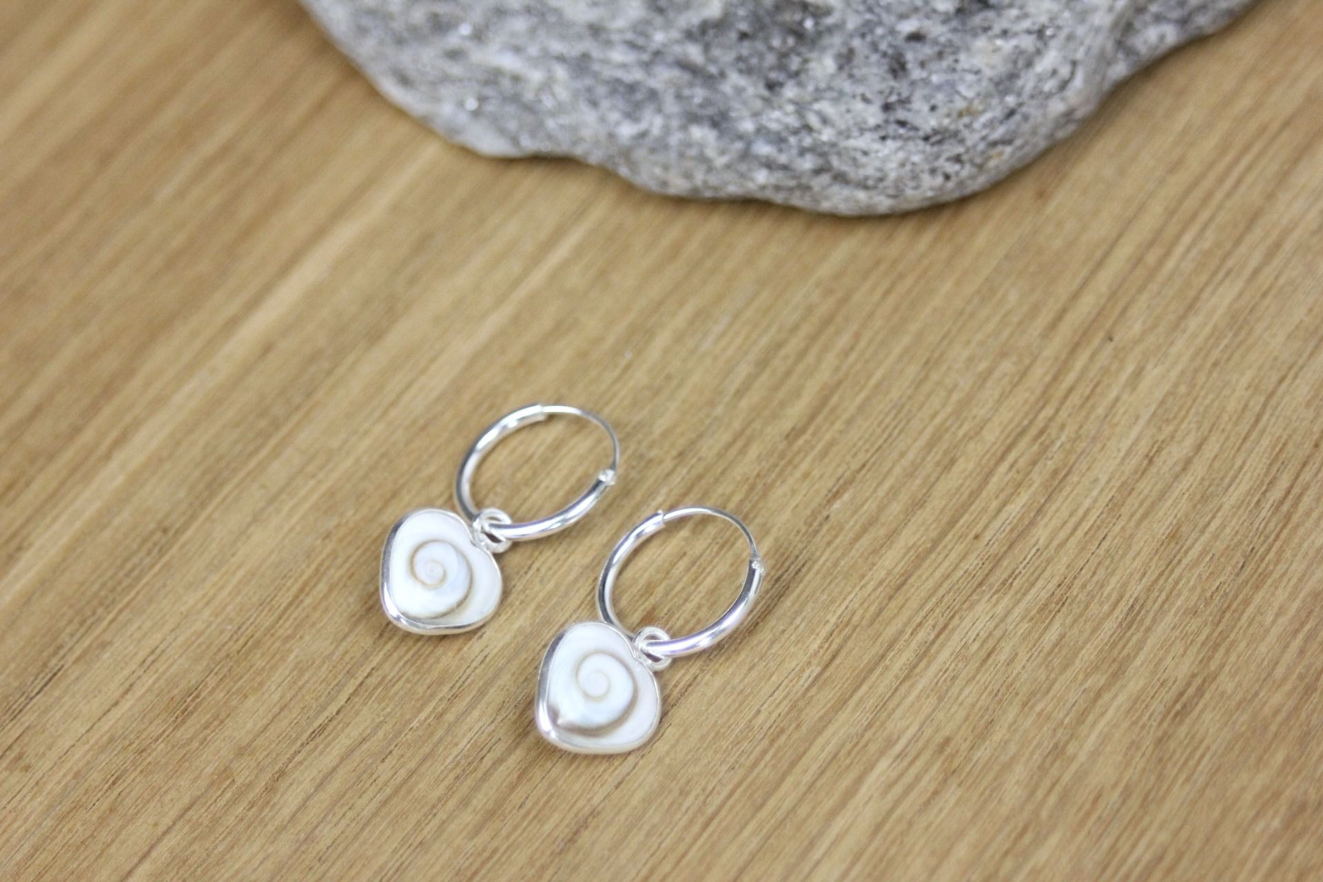 Elles se composent d'une petite créole en argent massif de 11mm, sur laquelle est accroché un petit coeur en oeil de sainte Lucie appelé également oeil de shiva de 9mm de diamètre, serti en argent massif 925.