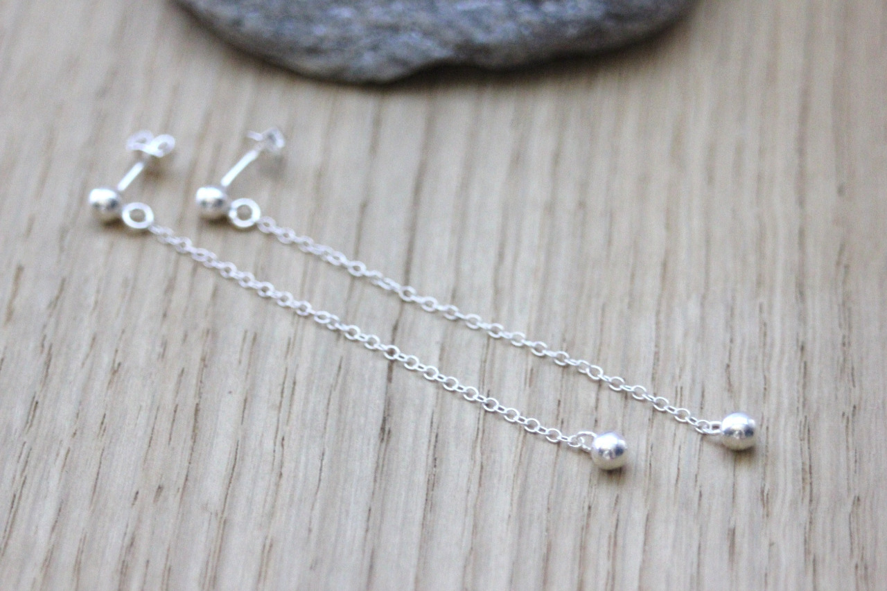 Boucles d'oreilles pendantes en argent massif de style minimalistes. Boucles d'oreilles puces avec chainettes et boules en argent.