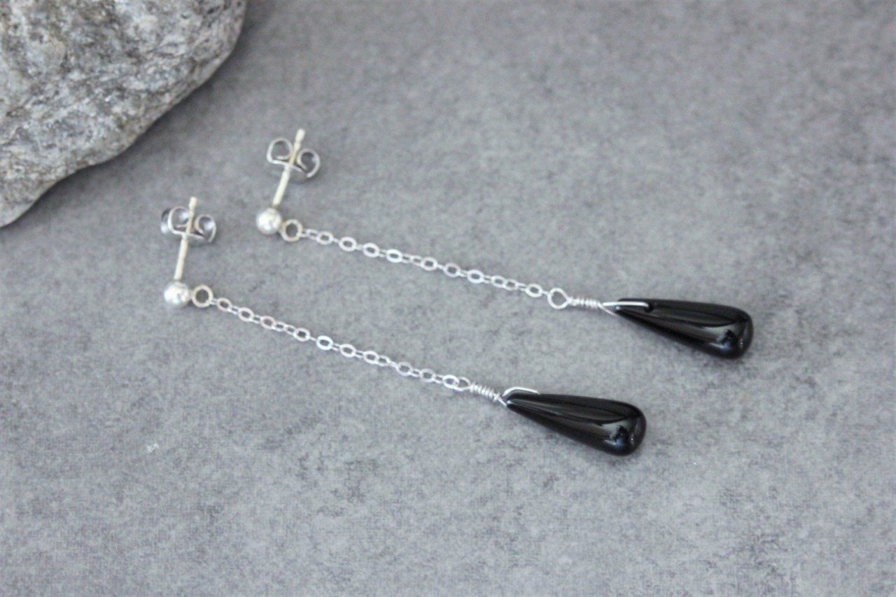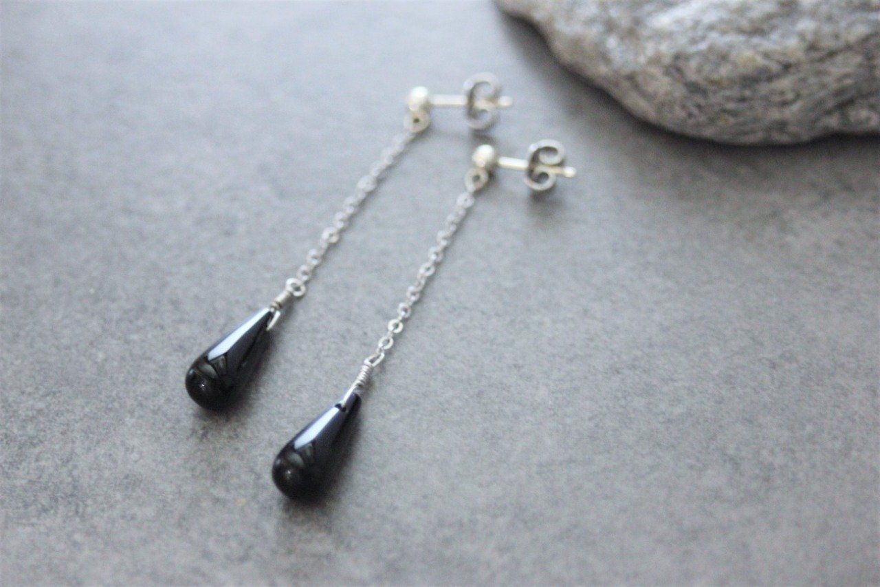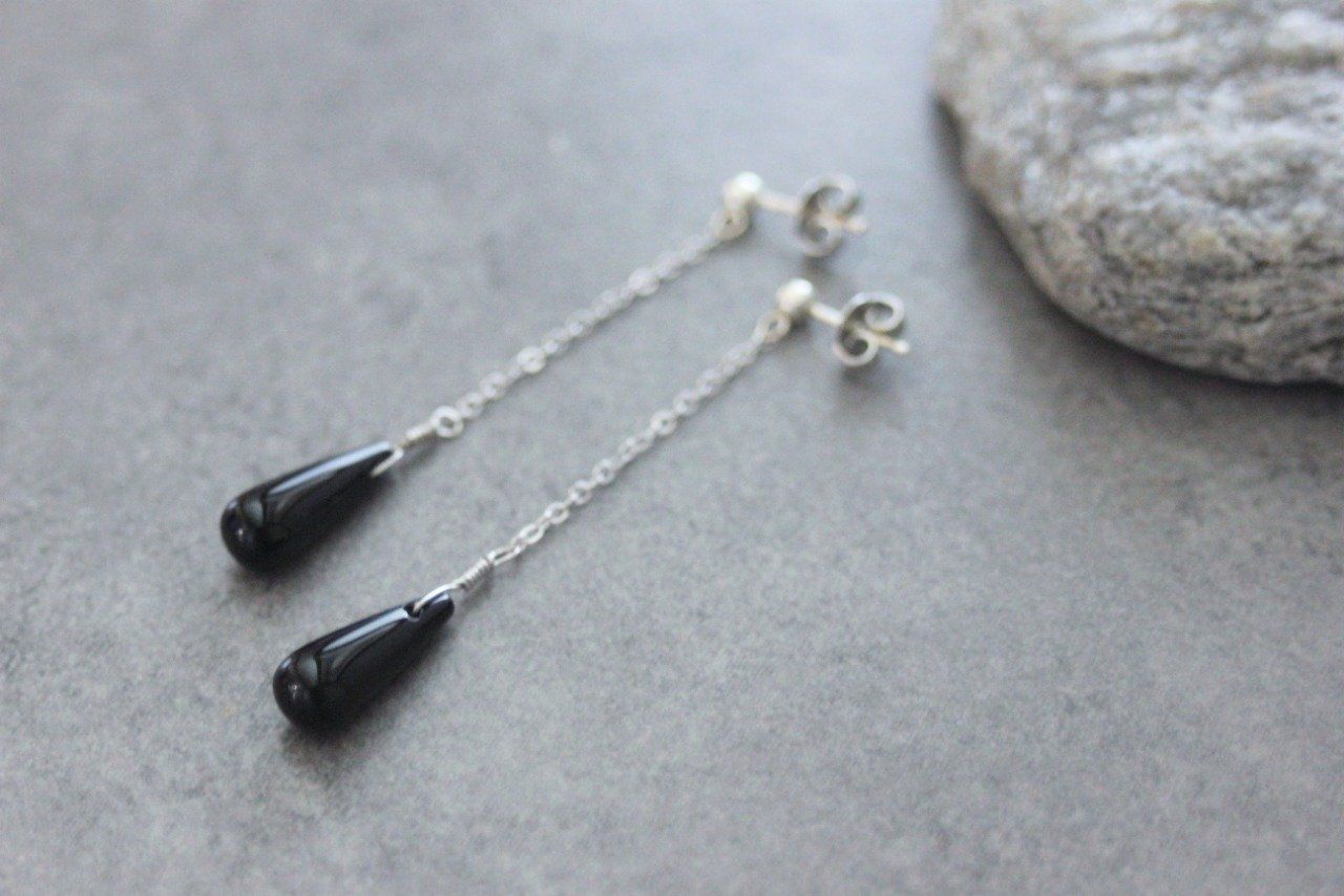 Boucles d'oreilles pendantes en onyx noir et argent massif - Boucles d'oreilles pierres naturelles - longues boucles d'oreilles pierres gemmes