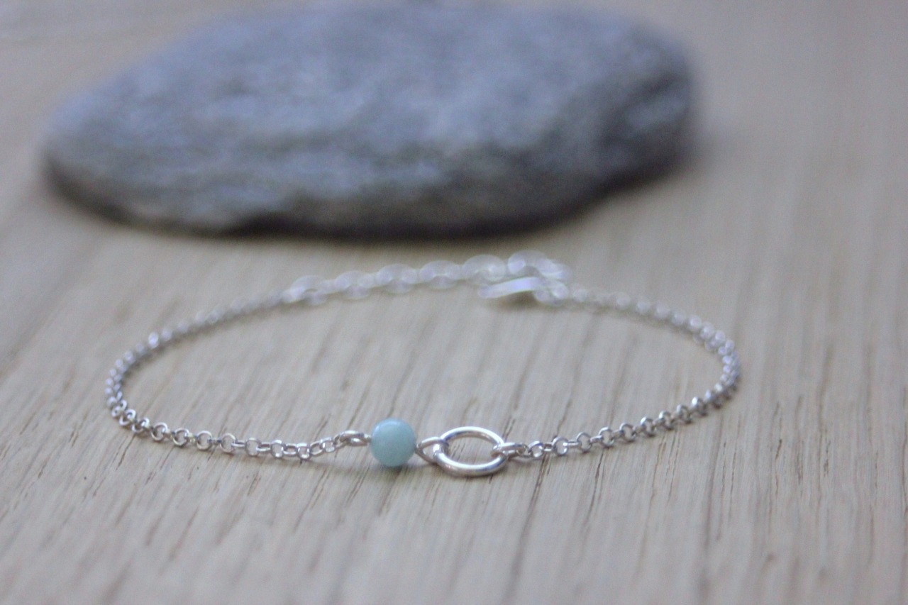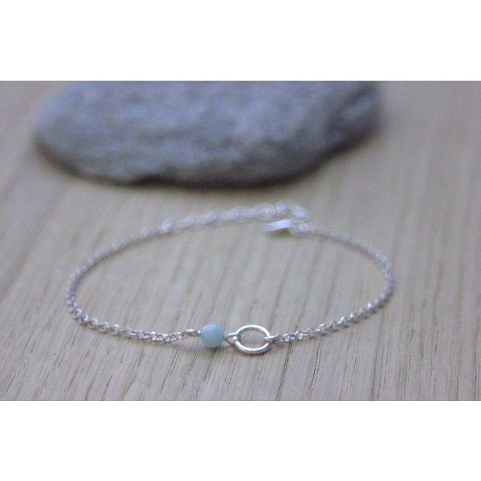 Bracelet en argent massif avec anneau et perle semi précieuse en amazonite. Longueur réglable. Plusieurs longueurs disponibles