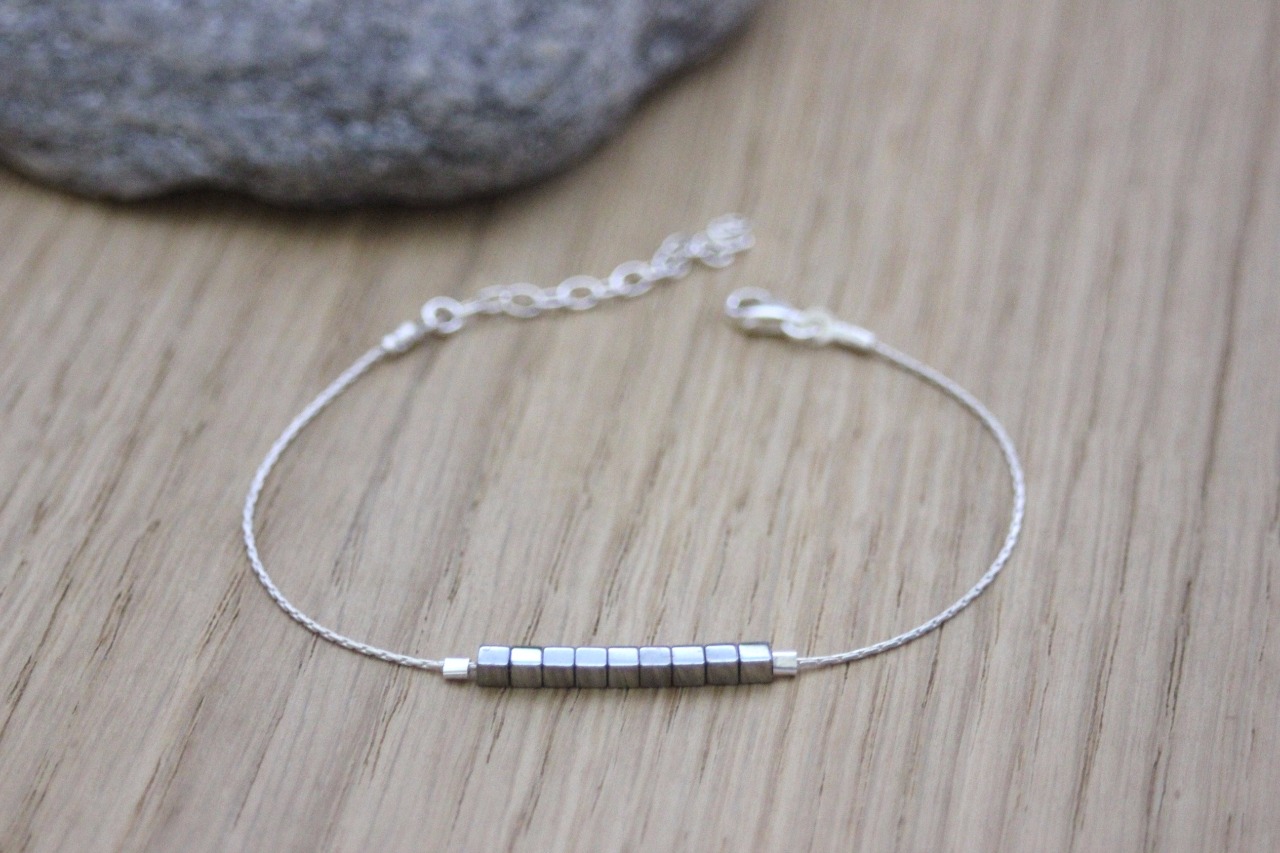 Bracelet en argent massif avec petits cubes en hématite argenté de 2mm. Longueur réglable.