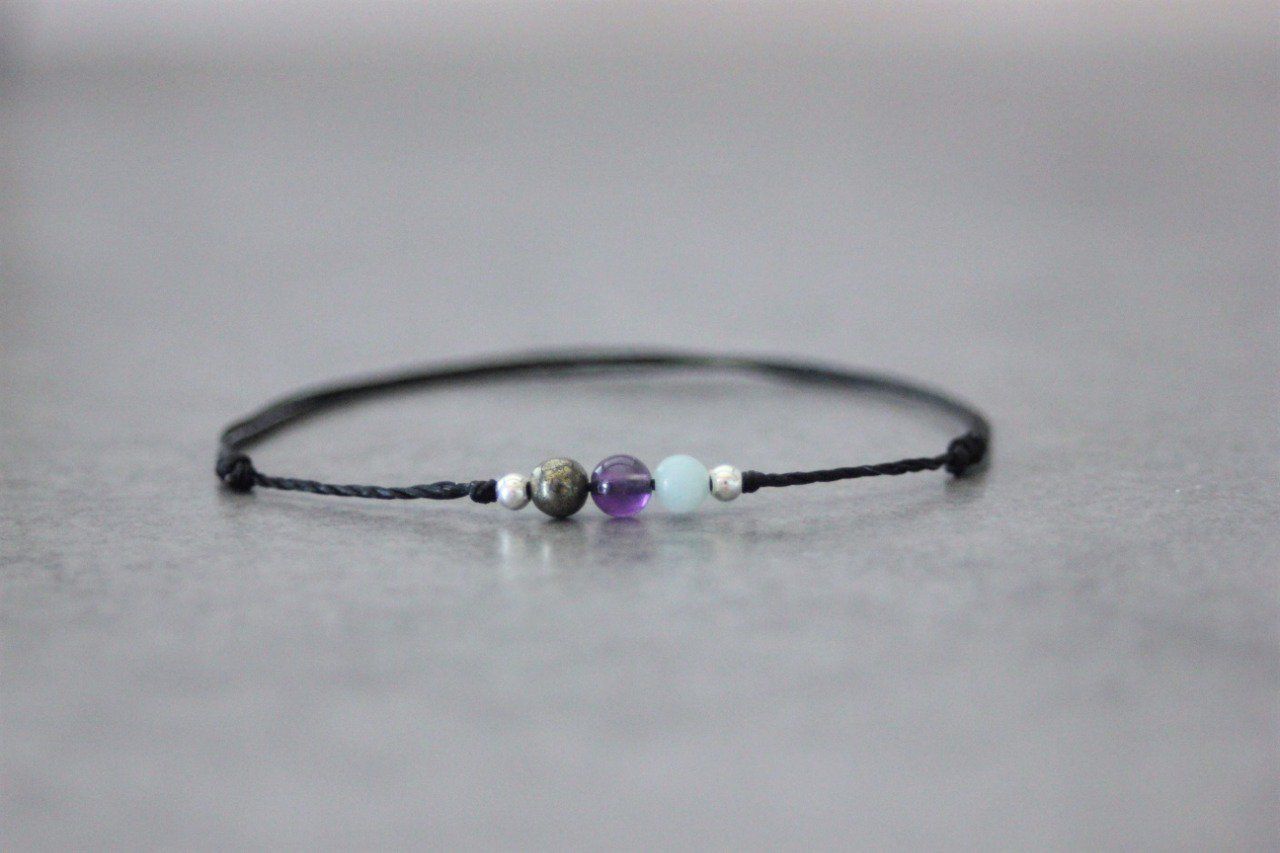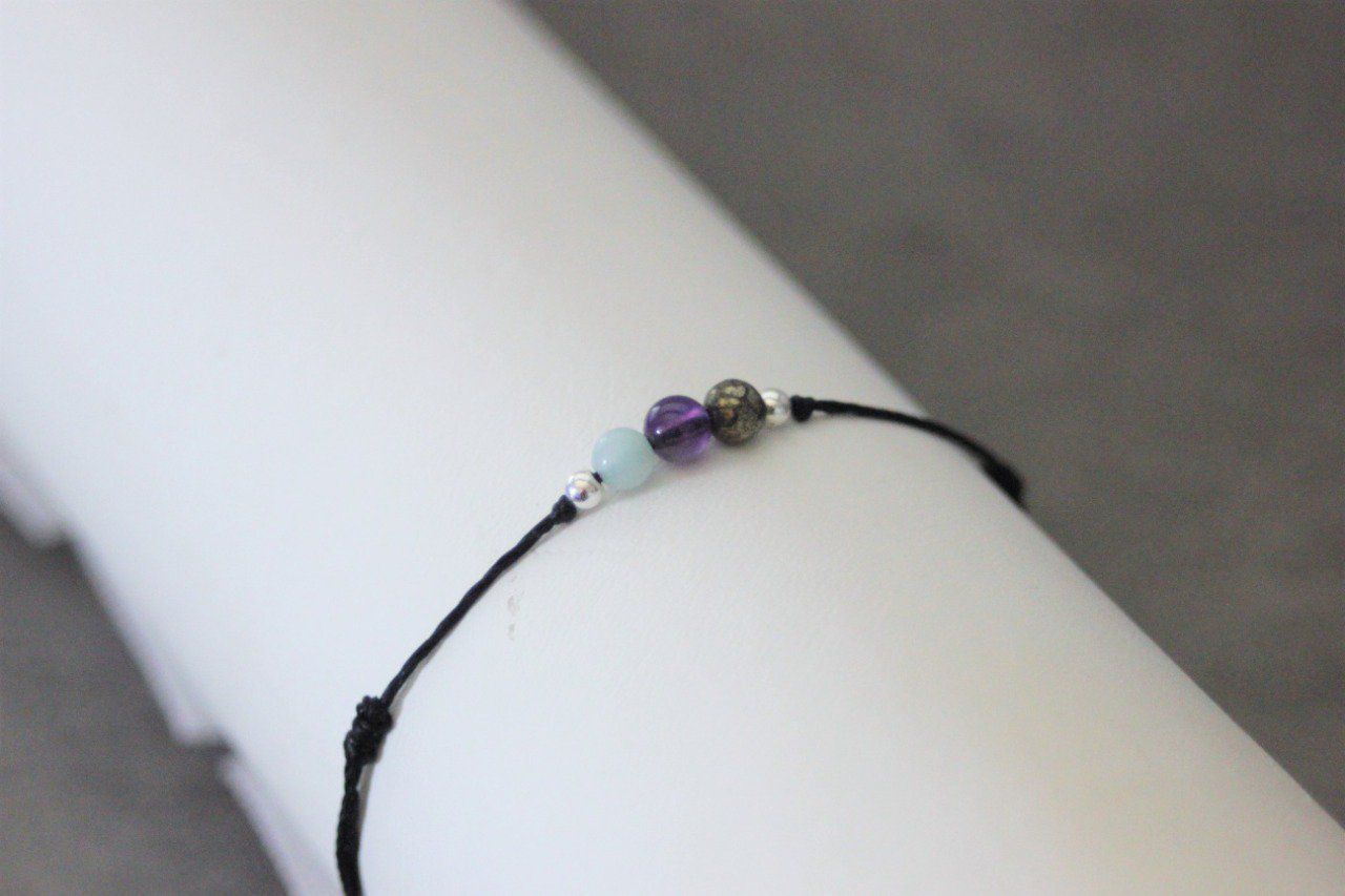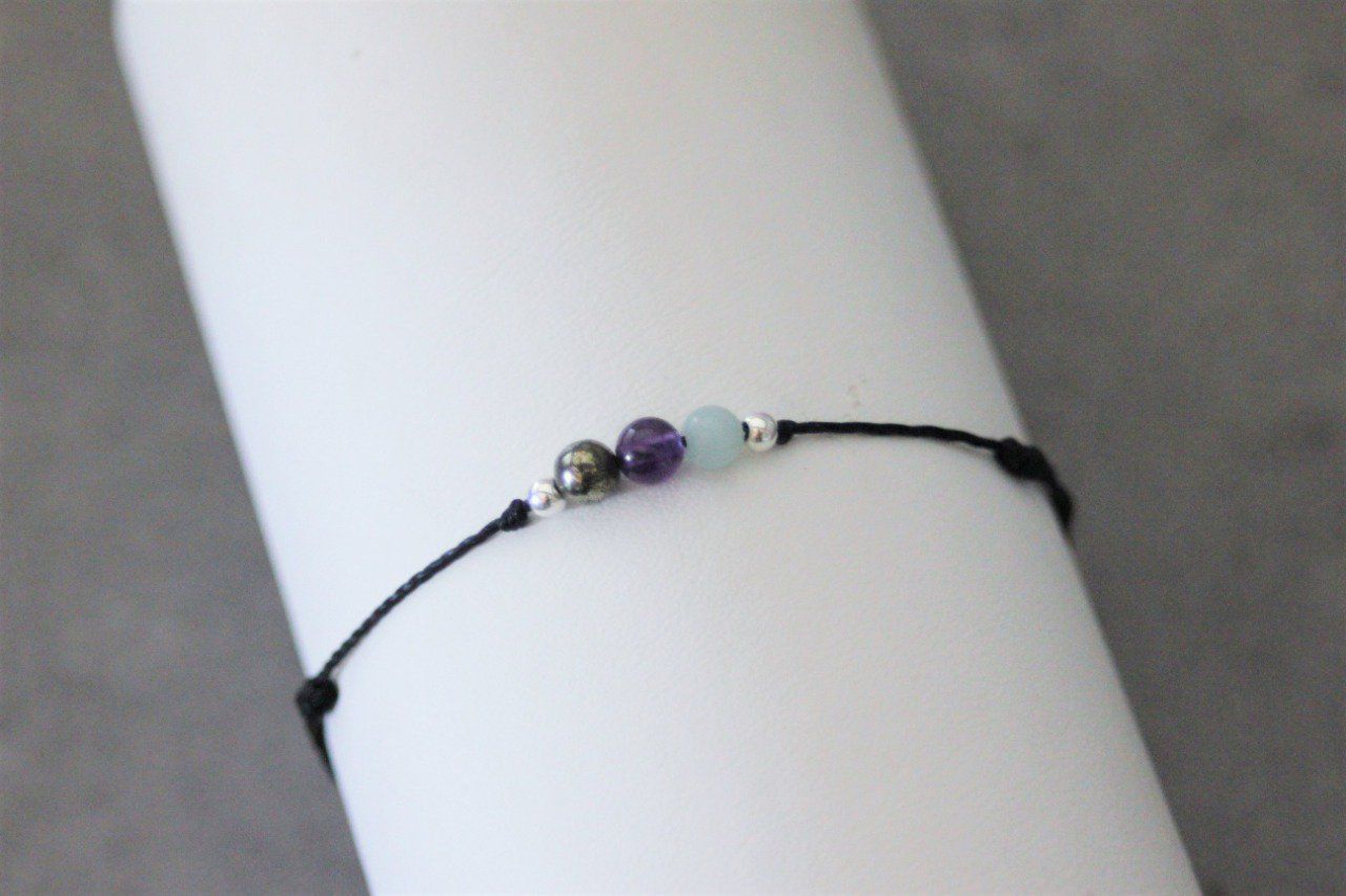 Bracelet cordon 3 perles, pyrite, améthyste et amazonite et perles argent massif