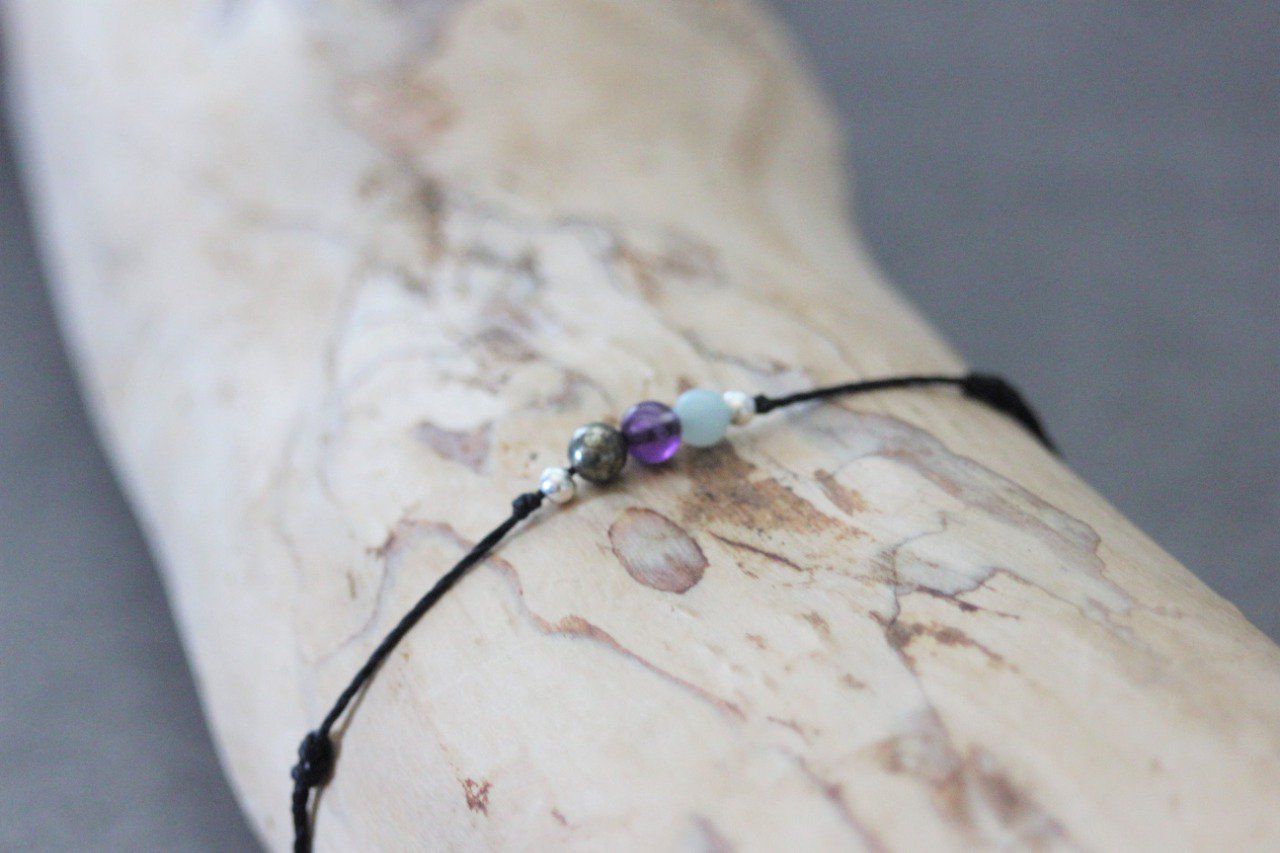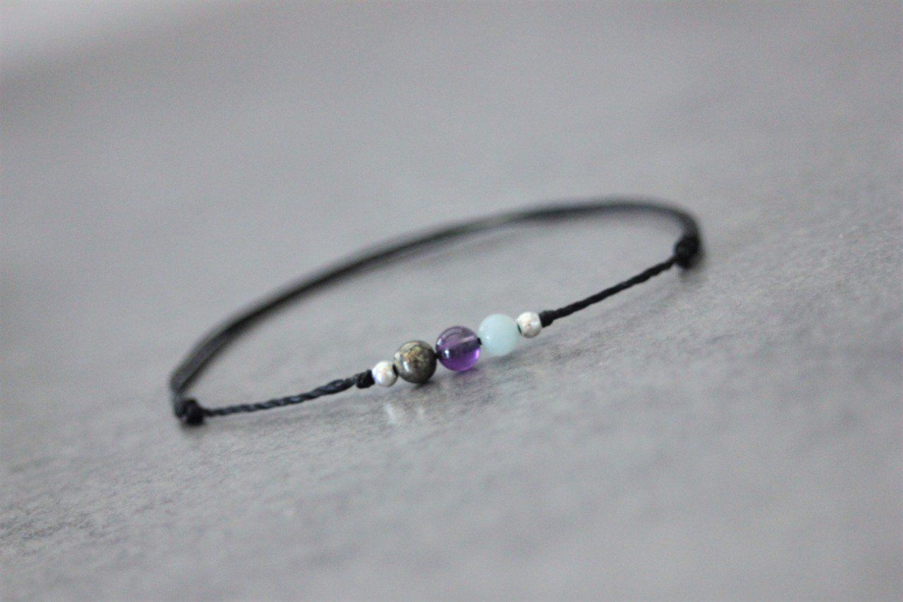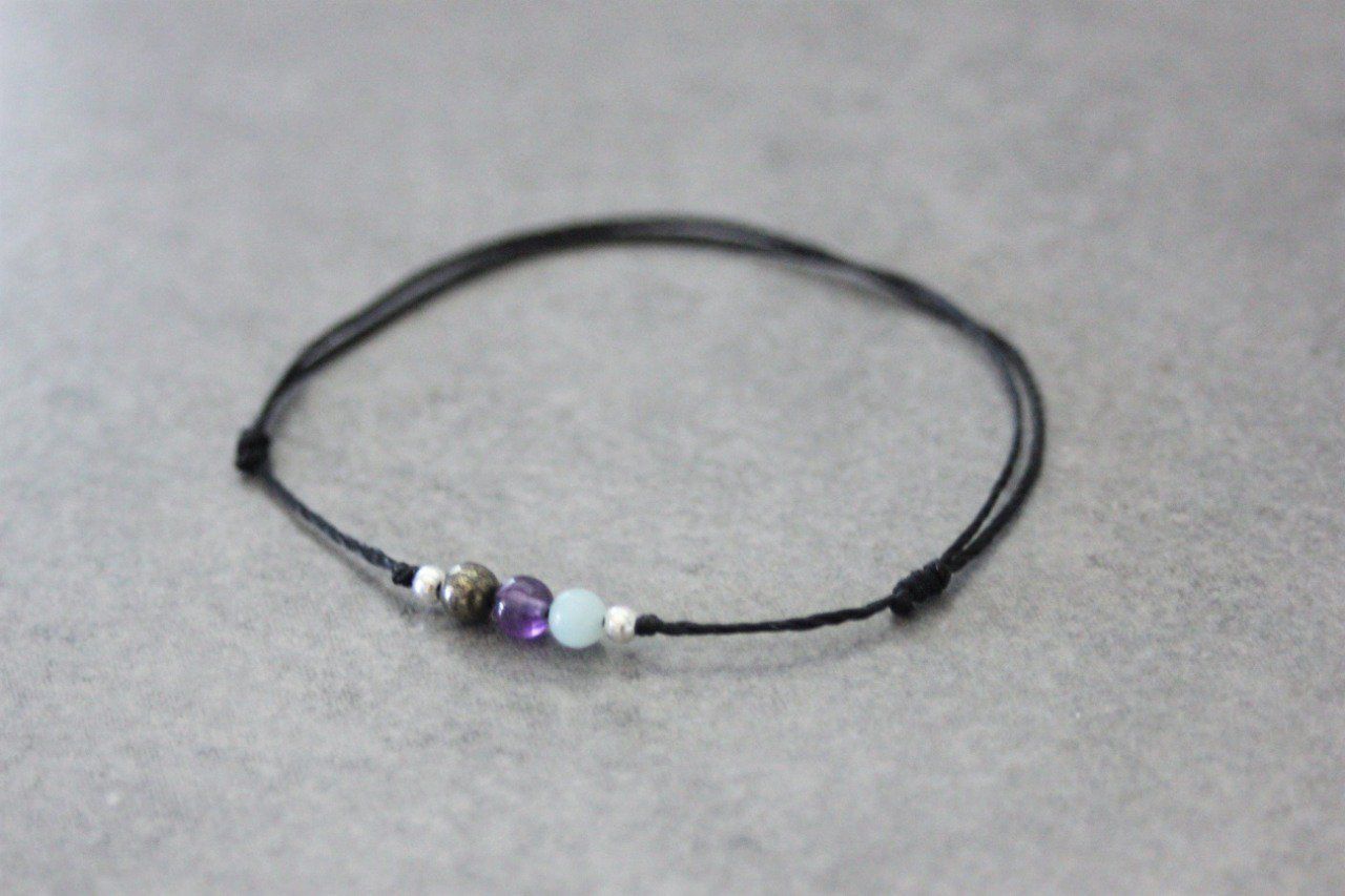 Bracelet cordon 3 perles, pyrite, améthyste et amazonite et perles argent massif