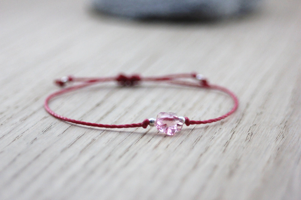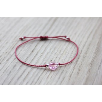 Bracelet cordon framboise avec petite fleur en cristal Swarovski rose et perles en argent massif