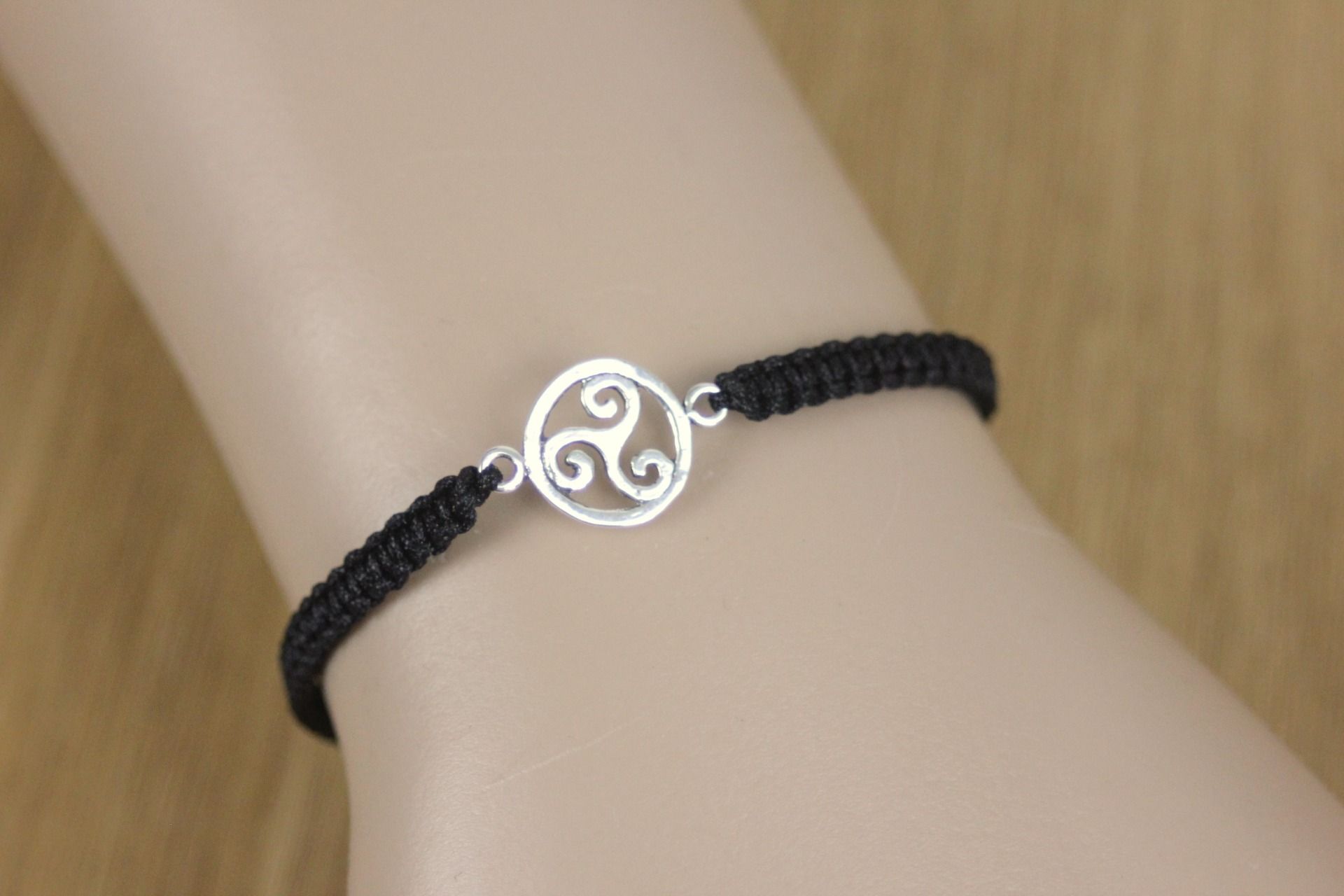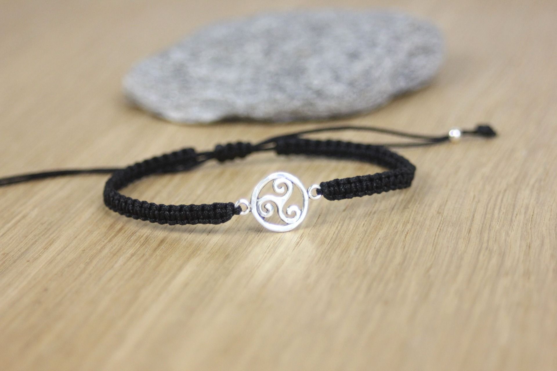 Bracelet cordon macramé noir breloque triskèle en argent massif 925 - bracelet d'amitié - bijoux mixte