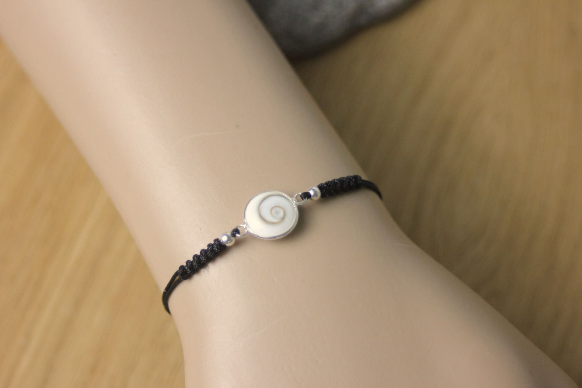 Bracelet cordon de couleur noir avec intercalaire coquillage appelé oeil de sainte Lucie ou oeil de Shiva et perles en argent massif. Longueur réglable. S'adapte à tous les poignets.