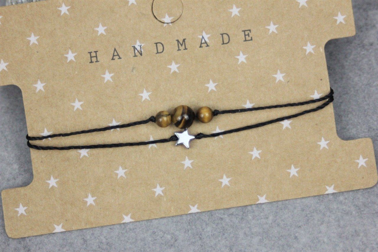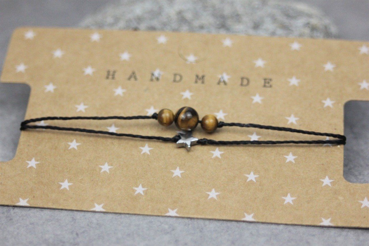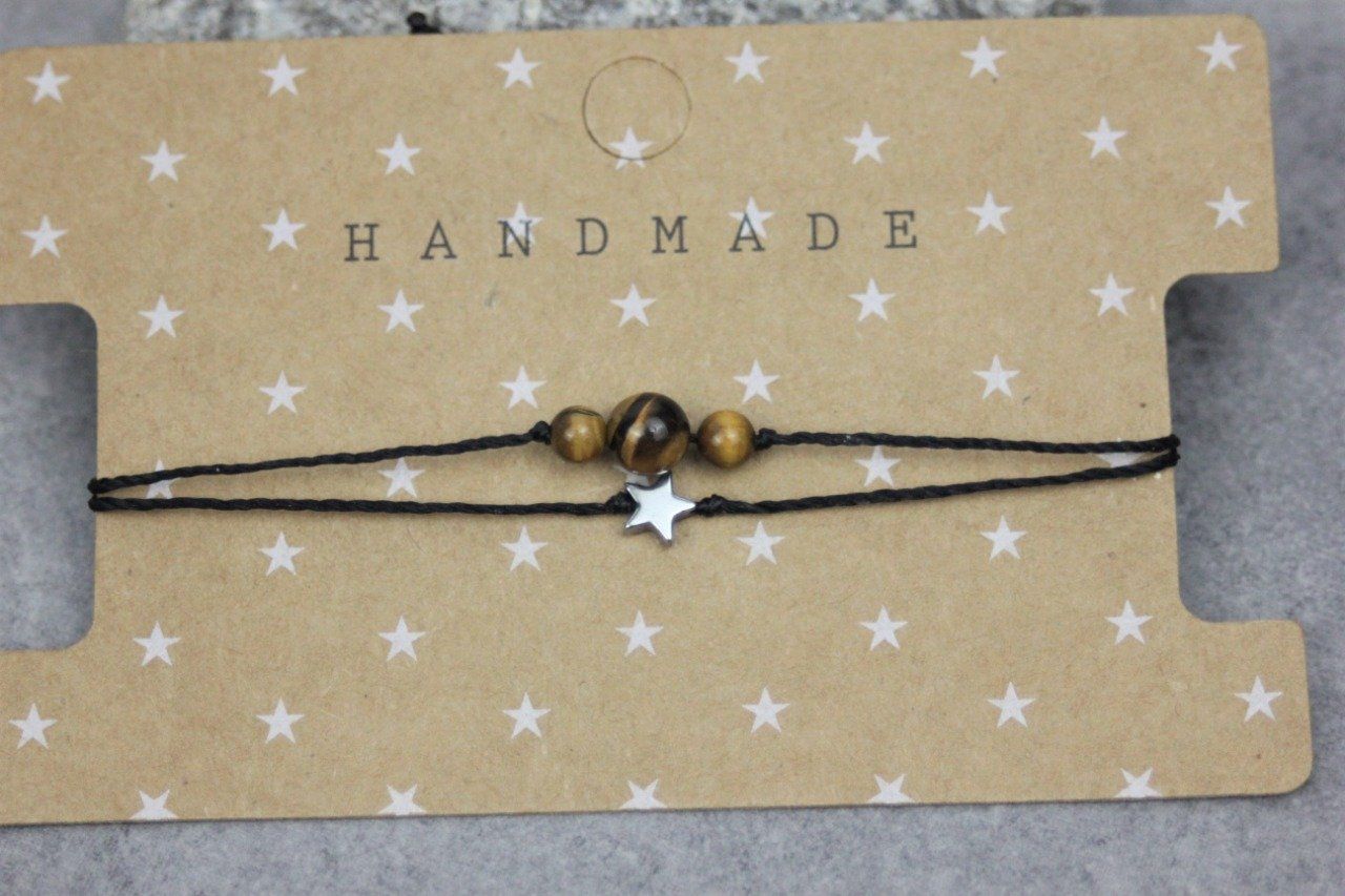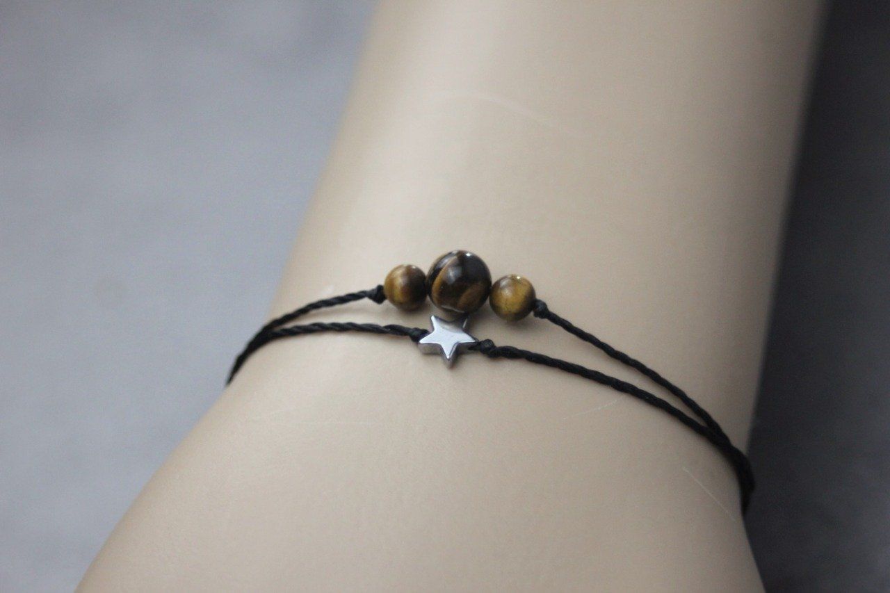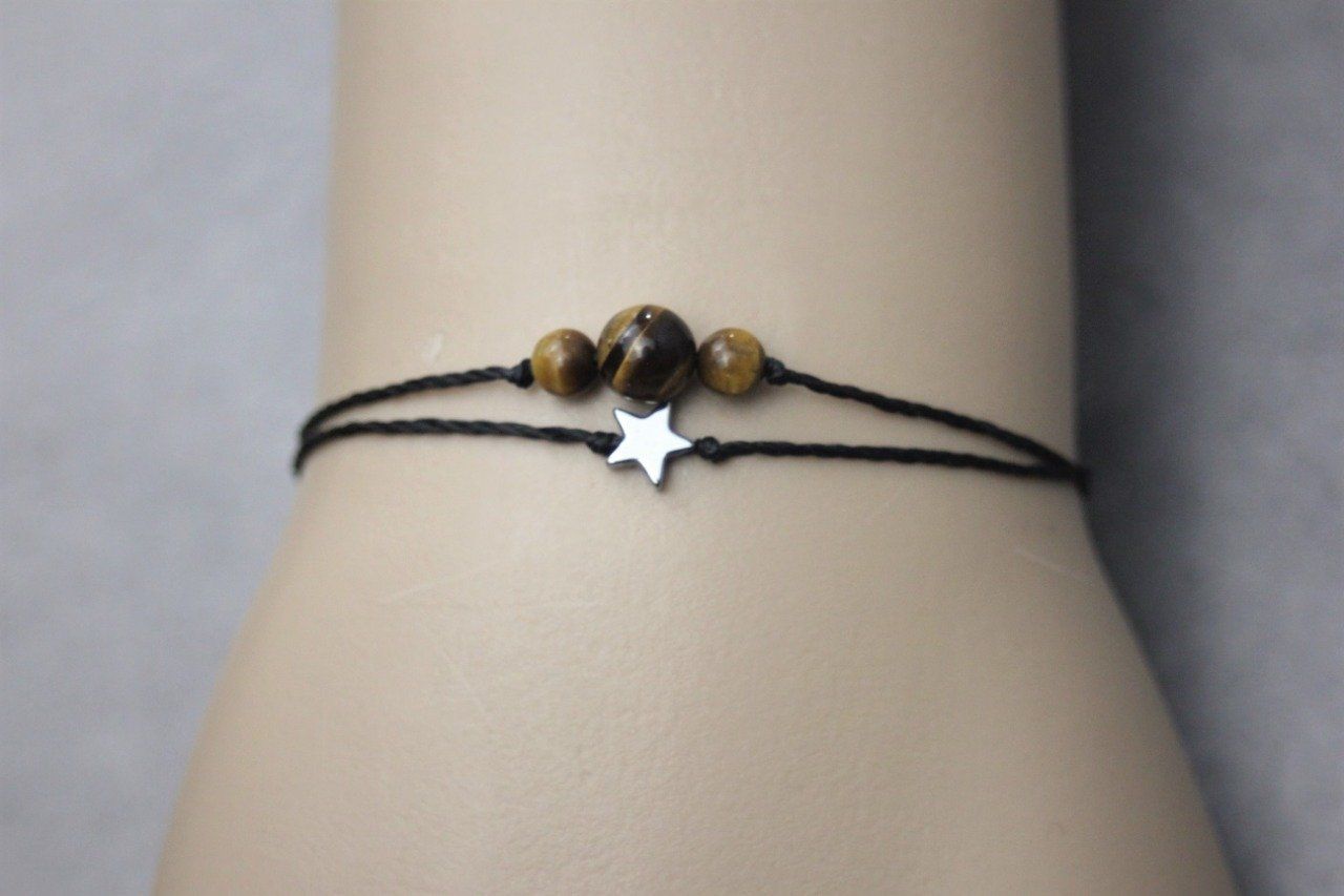 Bracelet cordon perles en oeil de tigre, étoile hématite et perles acier