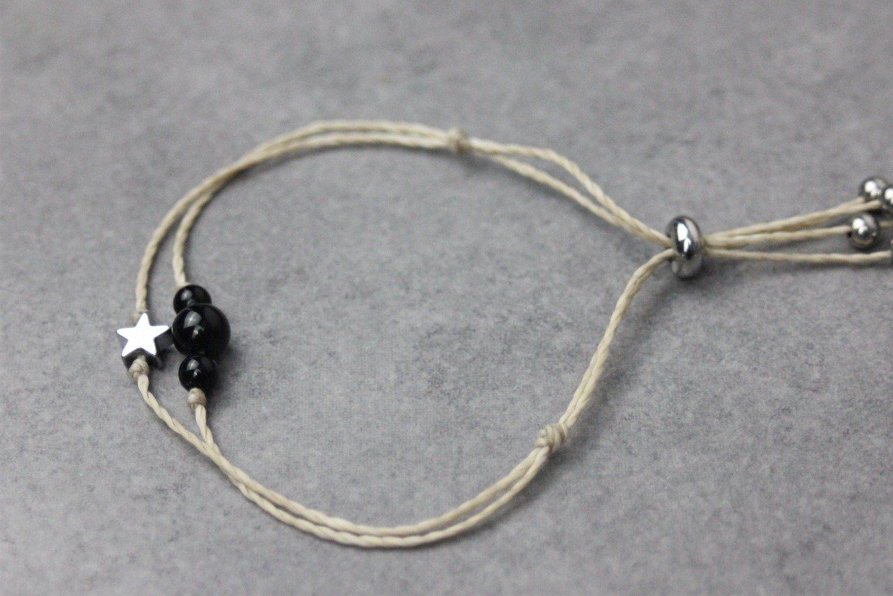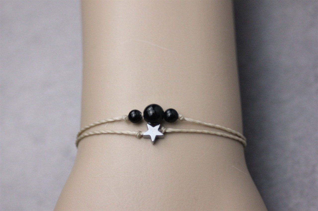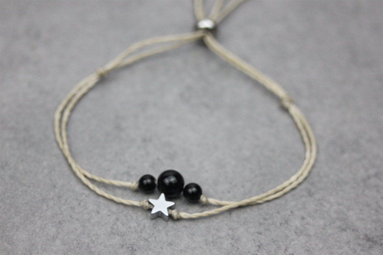 Bracelet cordon perles en onyx noir, étoile hématite et perles acier