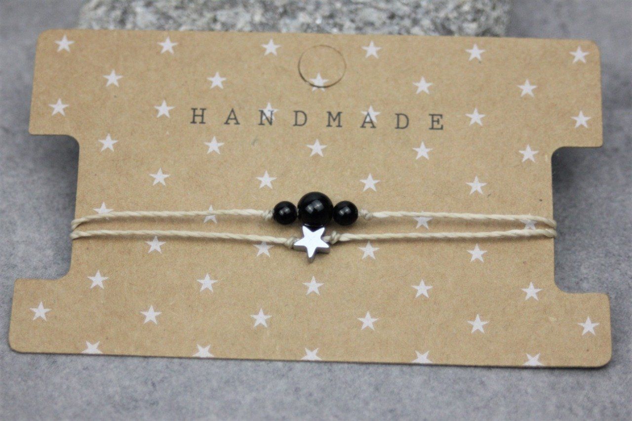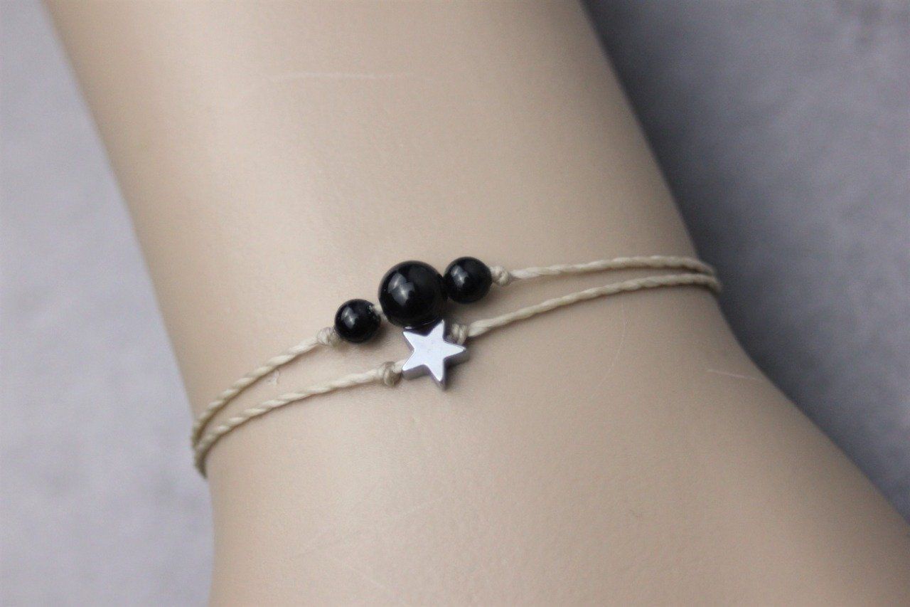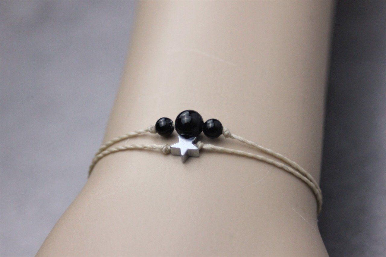 Bracelet cordon perles en onyx noir, étoile hématite et perles acier