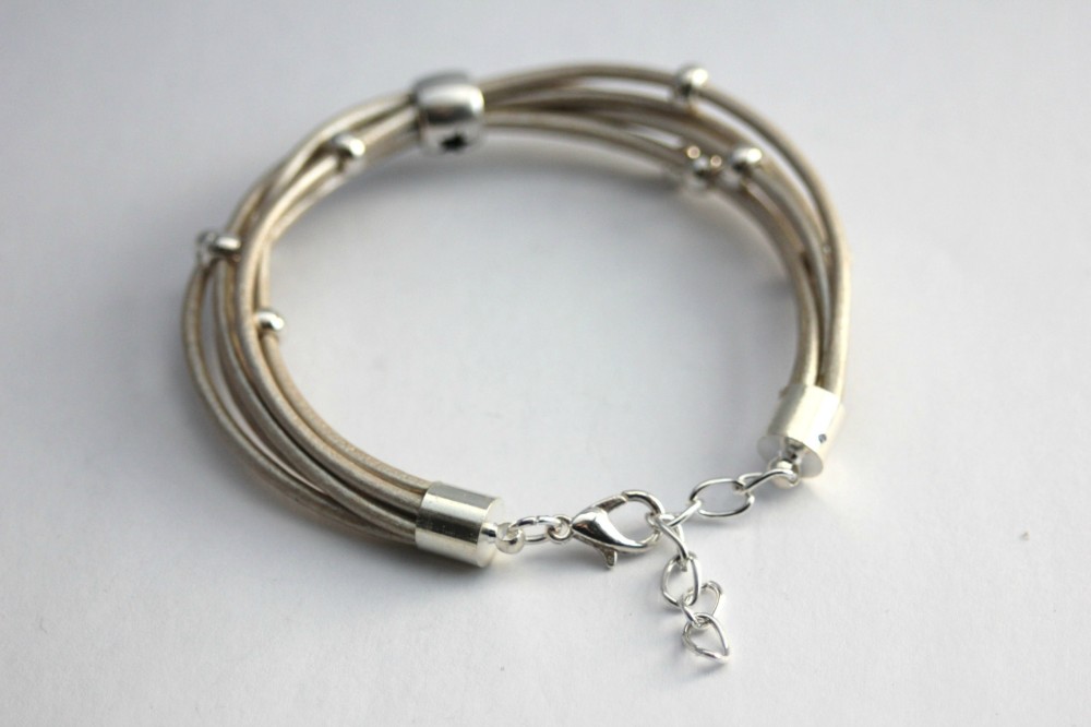 Bracelet en cuir blanc nacré perles rondes et perles étoiles en métal argenté