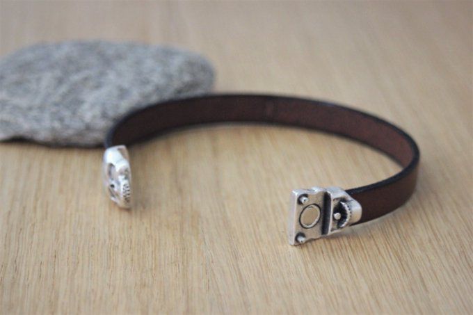 Bracelet homme en cuir noir ou marron fermoir tête de mort, style biker.