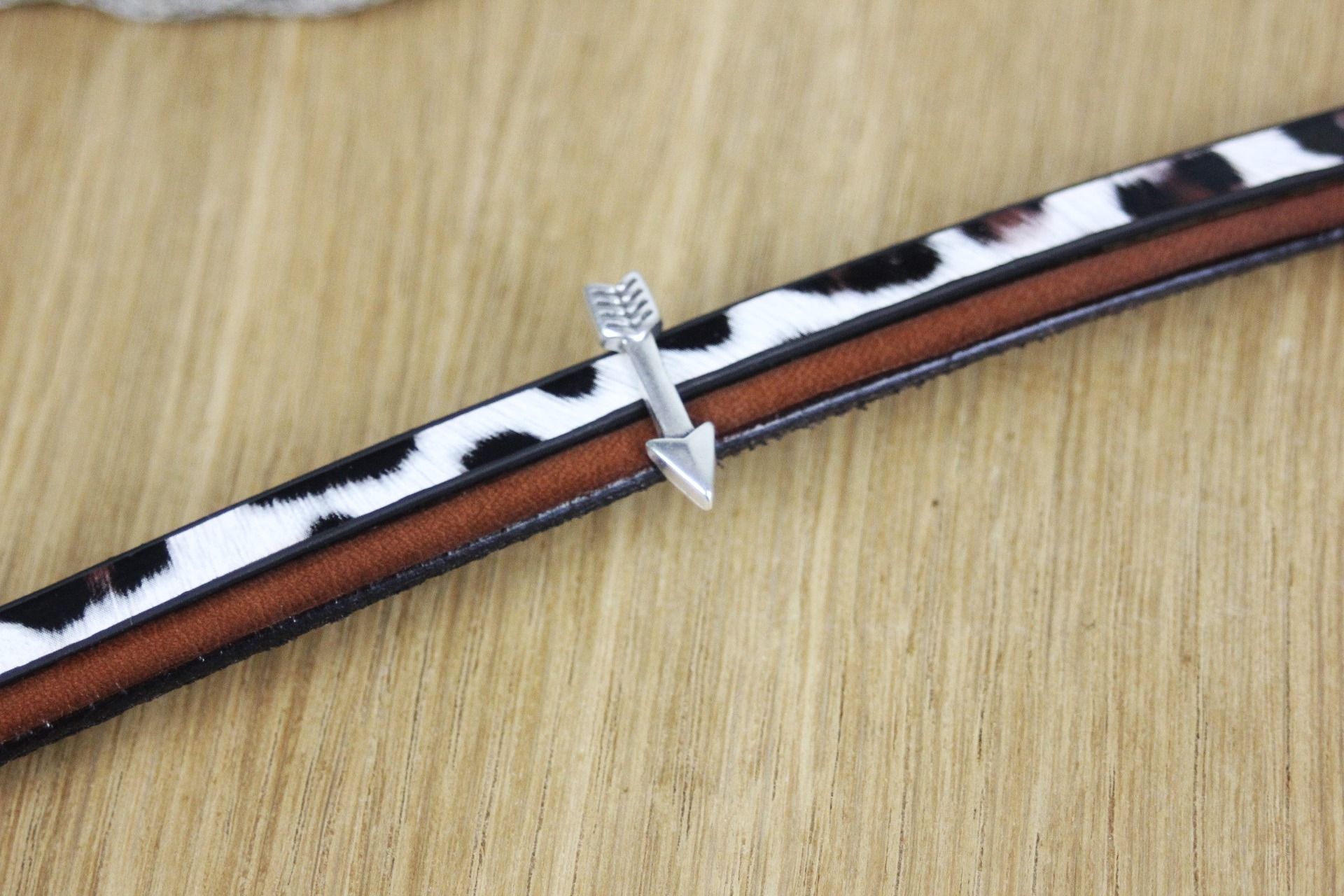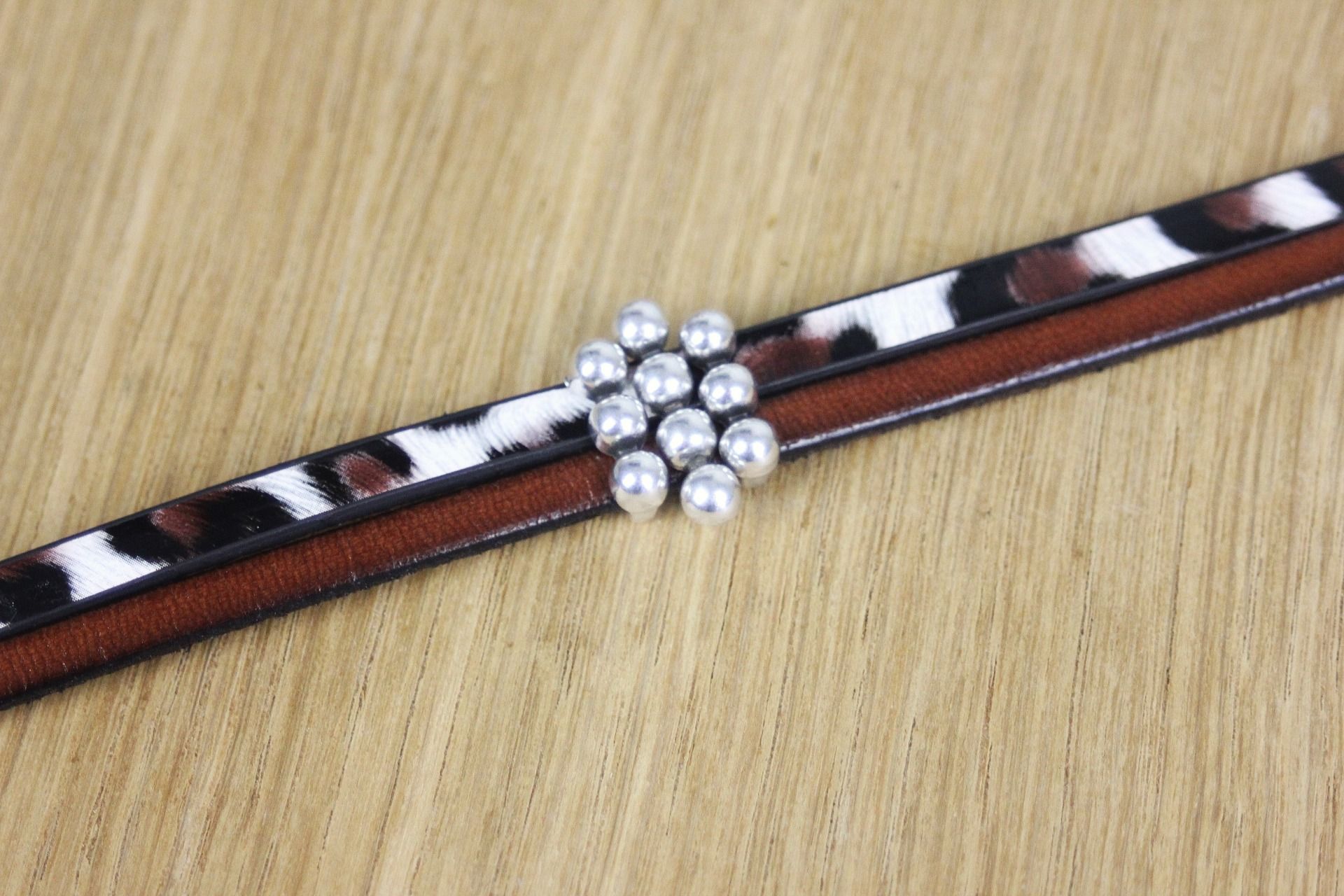 Bracelet en cuir marron chocolat et cuir léopard, avec breloques. Fermoir réglable en acier inoxydable.