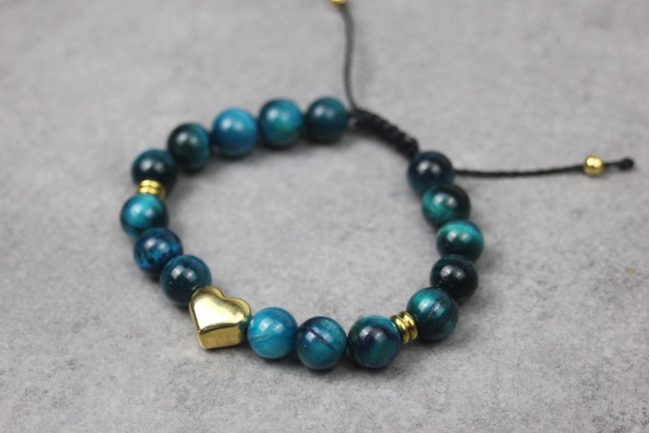 Bracelet femme en pierres naturelles oeil de tigre bleu et coeur en acier doré