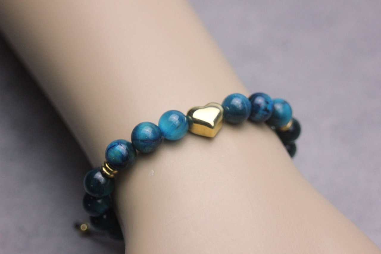 Bracelet en pierres naturelles semi-précieuses. Matériaux utilisés : perles oeil de tigre bleu, coeur et perles en acier inoxydable doré. Fermoir coulissant (convient à tous les poignets)
