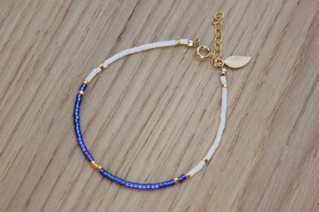 Bracelet fin et précieux en or Gold Filled et perles Miyuki doré, blanc et bleu cobalt. Longueur réglable.