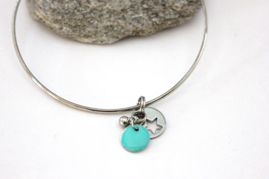Bracelet jonc en acier inoxydable avec breloque étoile et sequin émaillé vert aqua