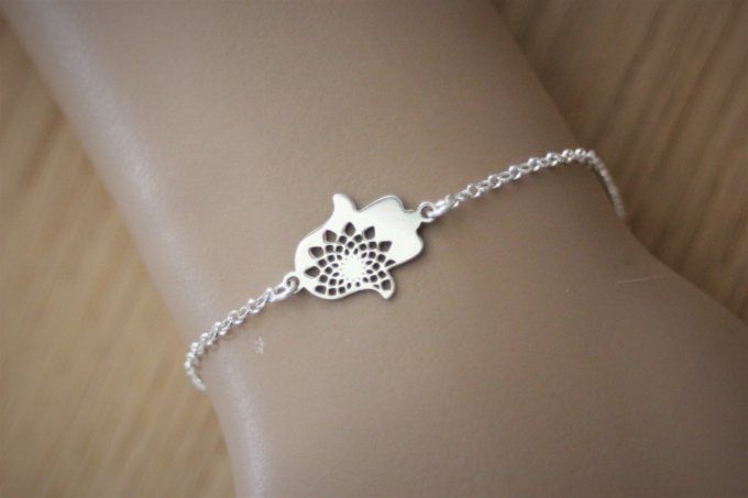 Bracelet en argent massif avec intercalaire main de fatma mandala. Longueur réglable. Plusieurs longueurs disponibles.