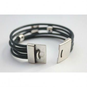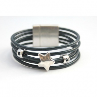 Bracelet manchette en cuir multi-rangs : 5 cordons de cuir bleu nuit,1 grosse perle en forme d'étoile et 2 perles rondes de 8mm avec étoile ajourée en métal argenté. Fermoir aimanté.
