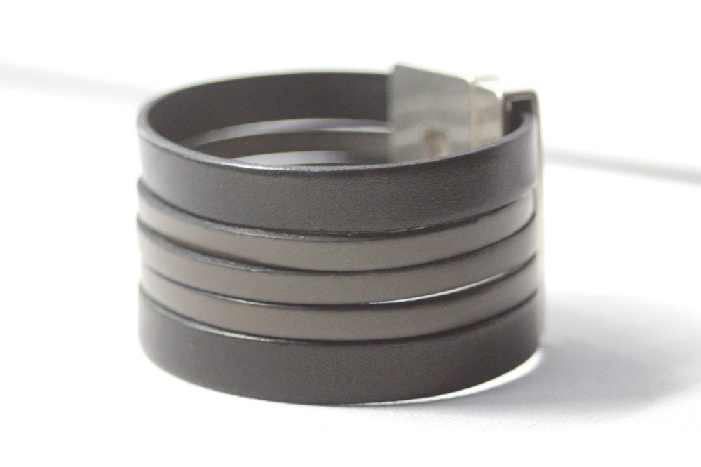 Bracelet manchette homme en cuir noir et cuir taupe. Fermoir aimanté en métal plaqué argent.