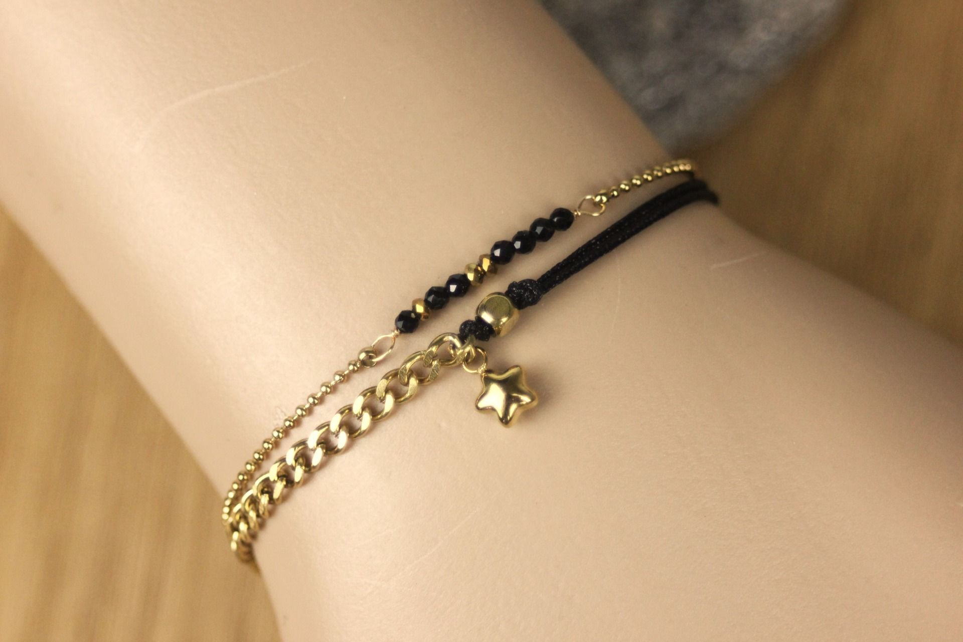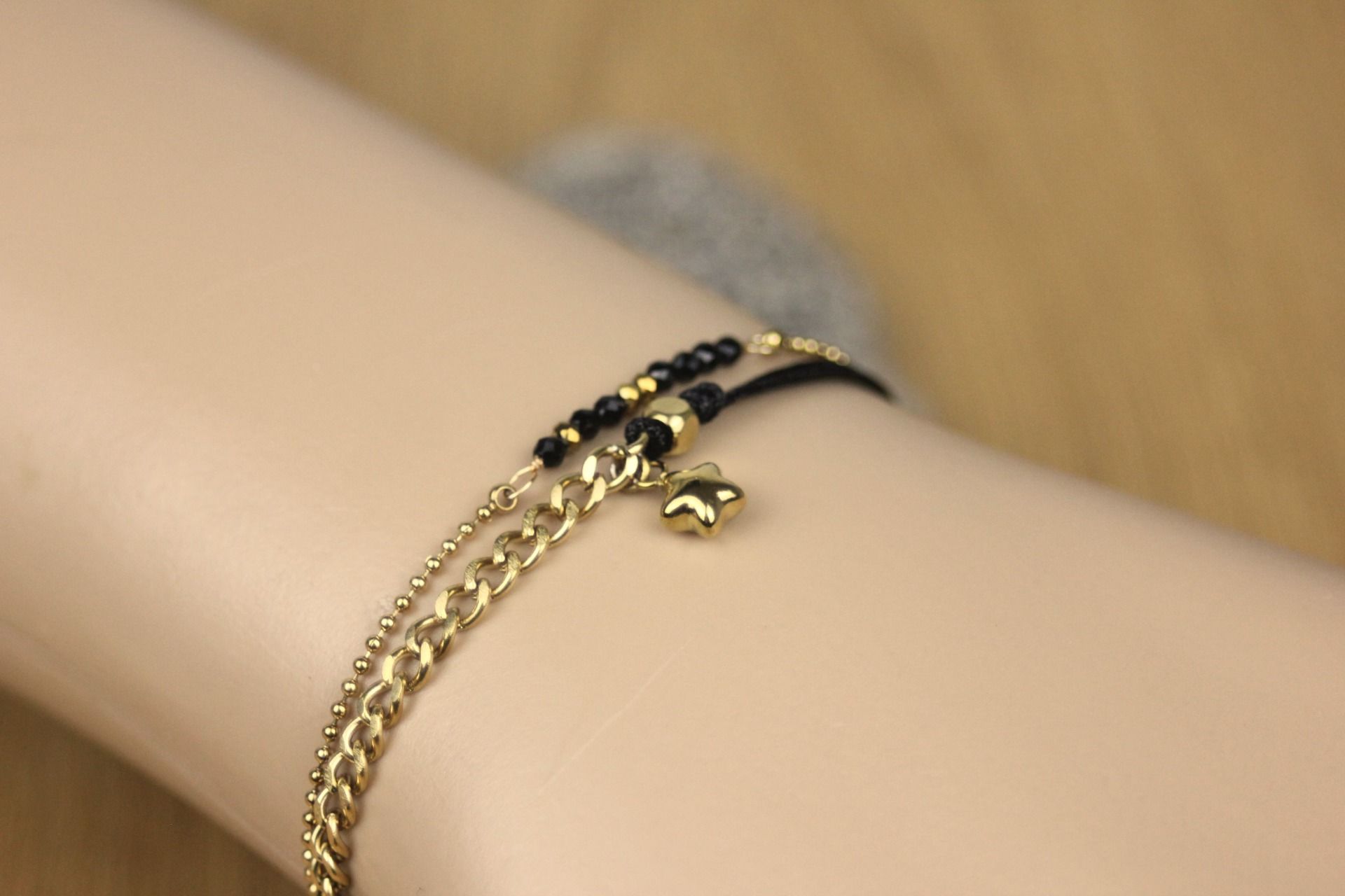 Bracelet acier inoxydable doré multirangs perles et cordon noir - bracelet étoile - bracelet 2 chaines