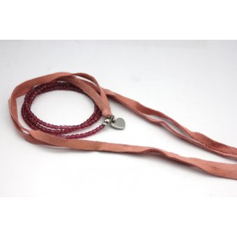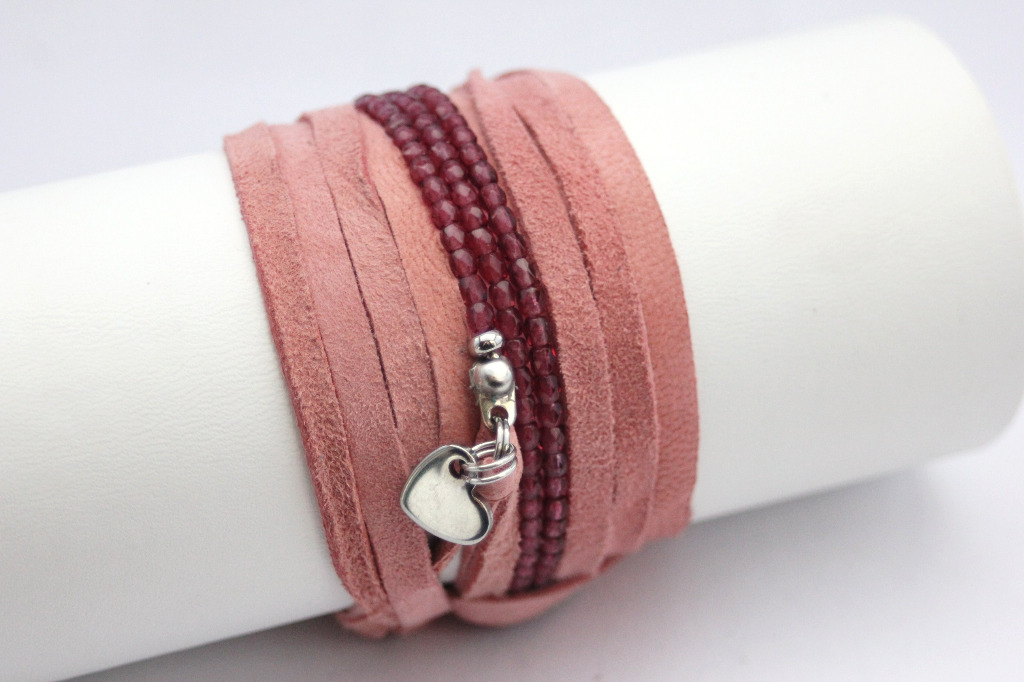 Bracelet "Nexus" rose. Bracelet wrap à enrouler autour du poignet. Il se compose de perles en verre de bohème fuchsia et de 2 doubles lacets en daim rose. Apprêts et breloque en acier. Taille unique.