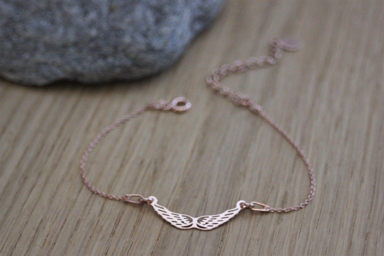 Bracelet en argent massif plaquage or rose de style minimaliste ailes d'ange en or rose. Longueur réglable.