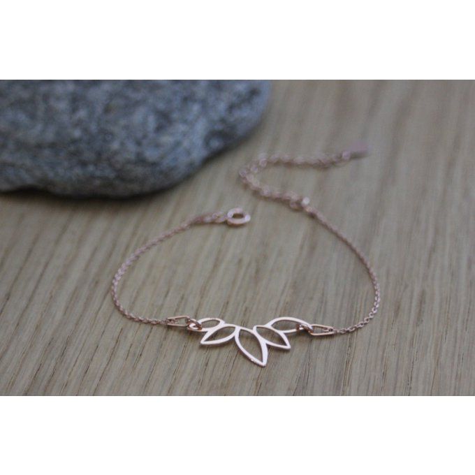 Bracelet en argent massif doré rose avec intercalaire feuille asymétrique. Longueur réglable.