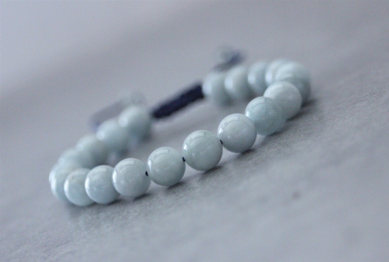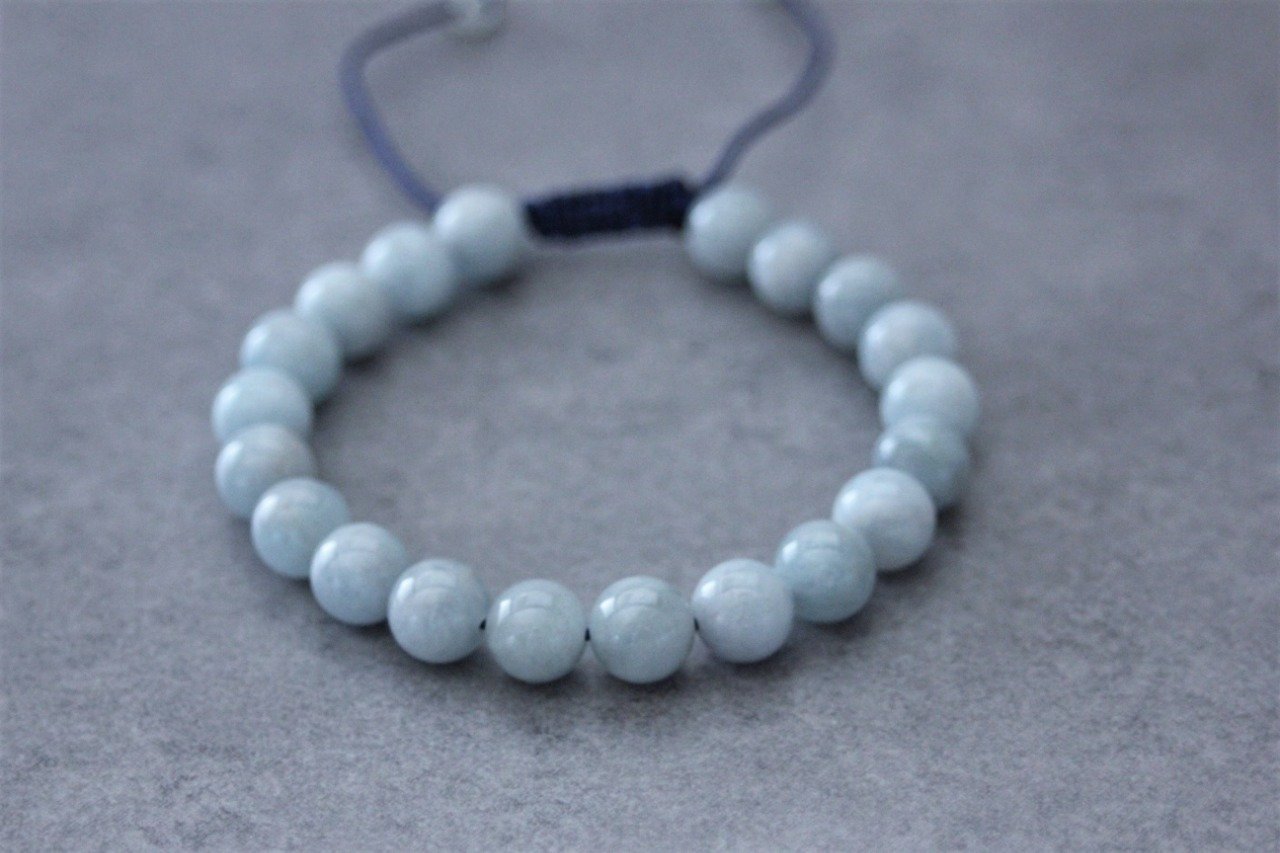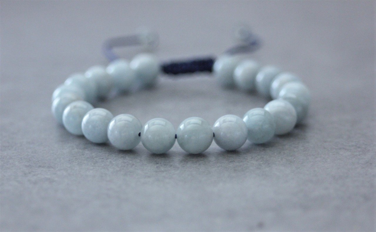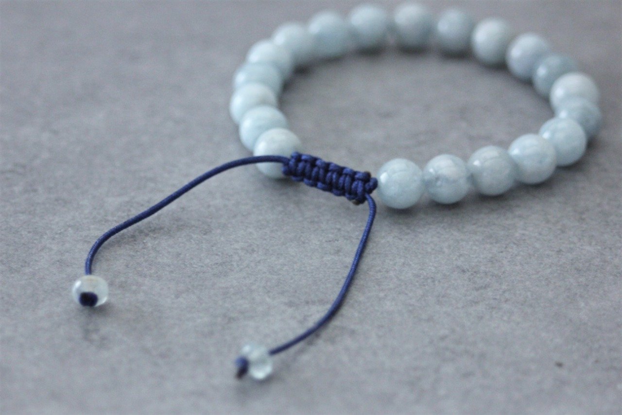 Bracelet ajustable avec fermoir coulissant de type macramé se terminant par 2 perles en aigue marine.