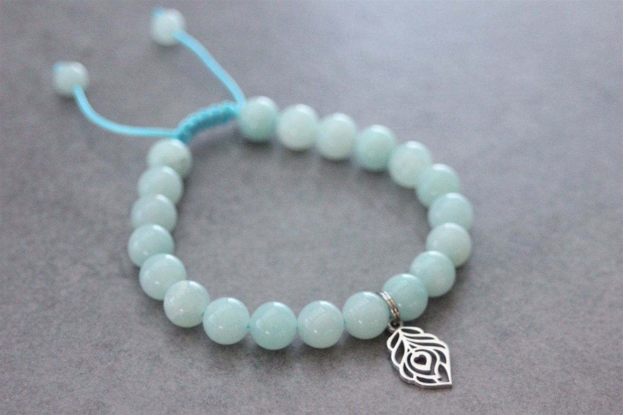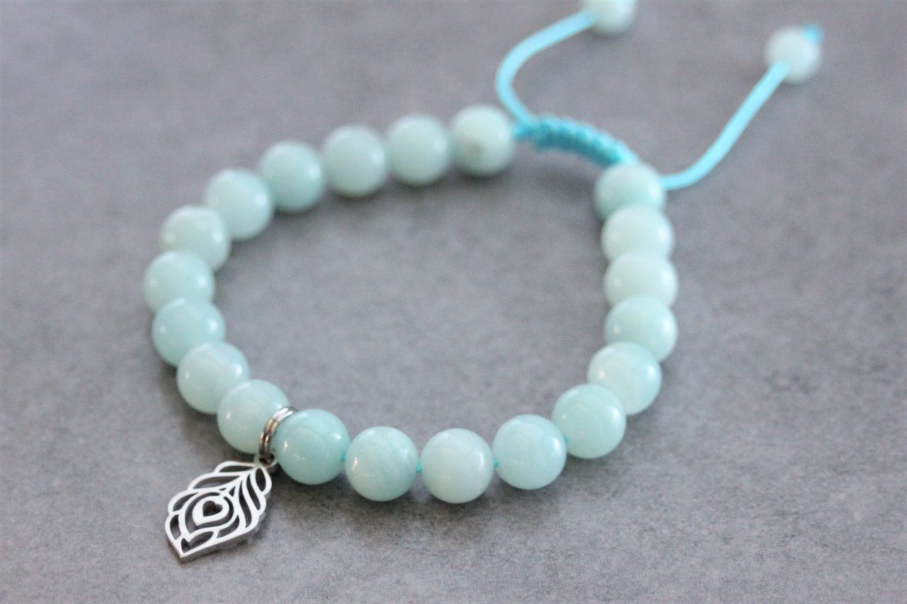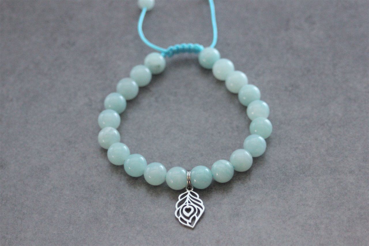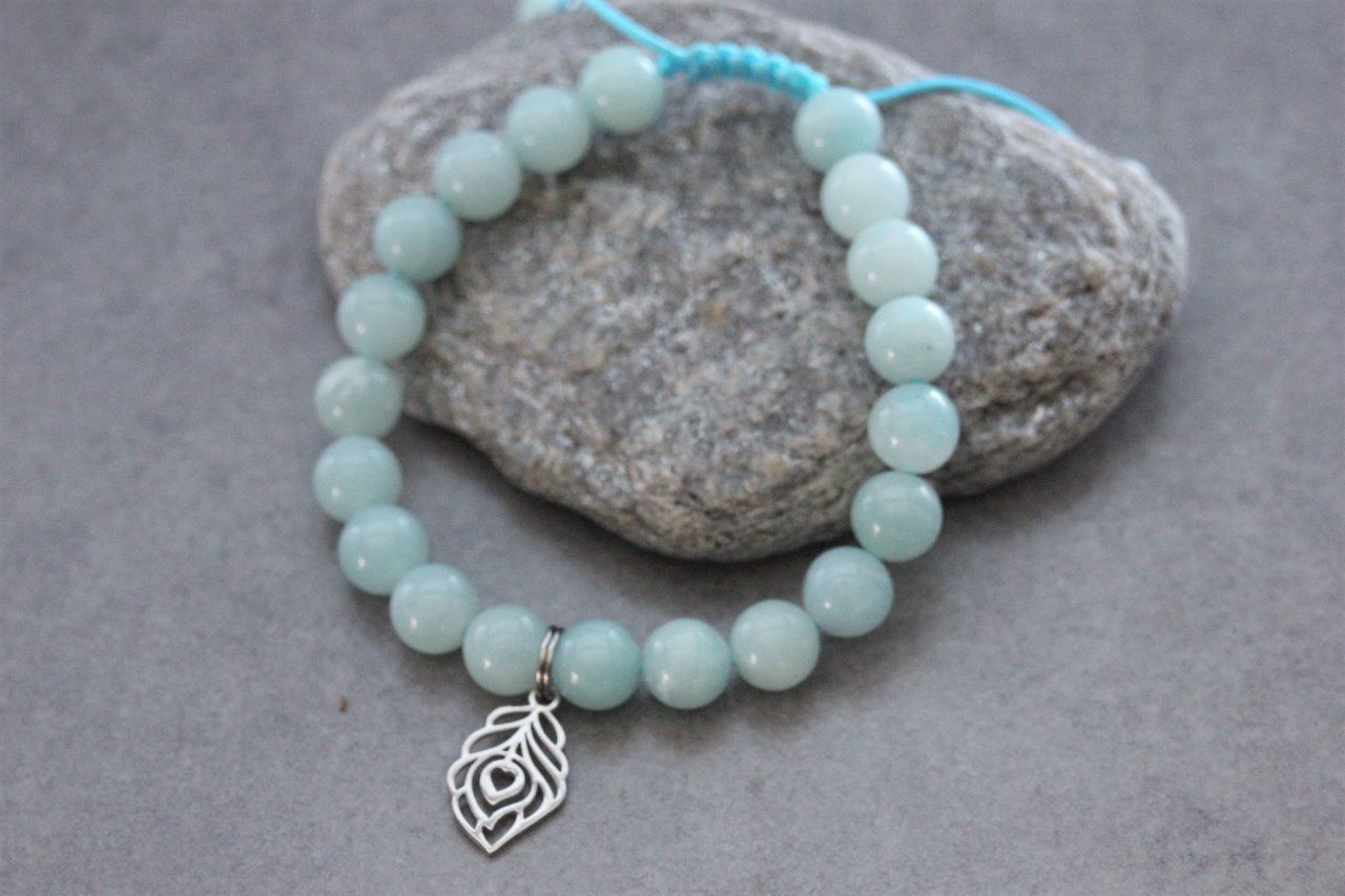 Bracelet en pierres naturelles semi-précieuses et acier inoxydable. Matériaux utilisés : perles amazonite, et breloque plume de paon en acier inoxydable. Fermoir coulissant (convient à tous les poignets)