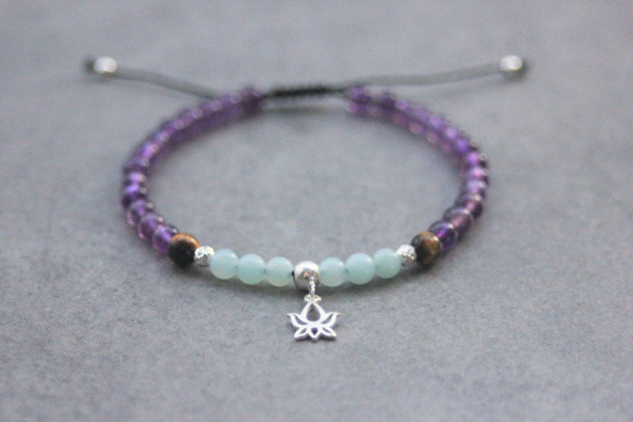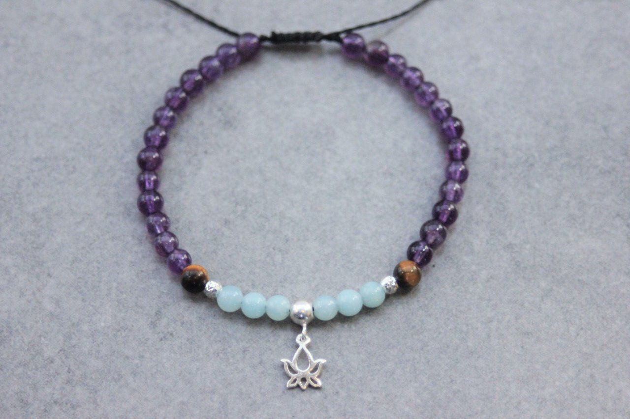 Bracelet en pierres naturelles semi-précieuses et argent massif 925. Matériaux utilisés : perles améthyste, perles amazonite, perles oeil de tigre avec perles et breloque fleur de lotus en argent 925. Fermoir coulissant (convient à tous les poignets)