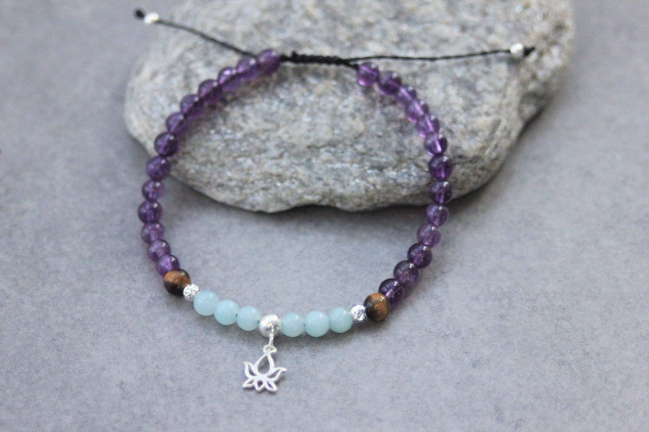 Bracelet perles améthyste, amazonite, oeil de tigre et fleur de lotus argent massif 925 - bracelet femme en pierres naturelles