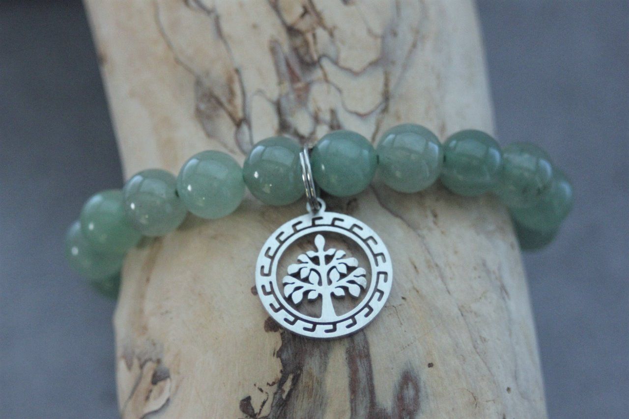 Bracelet en pierres naturelles semi-précieuses et acier inoxydable. Matériaux utilisés : perles aventurine verte et breloque arbre de vie en acier inoxydable.