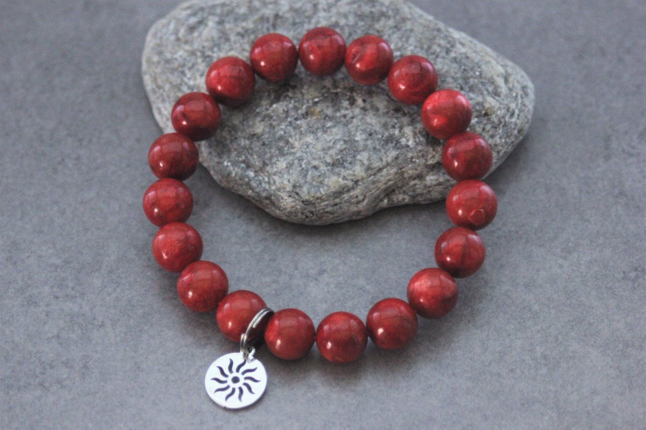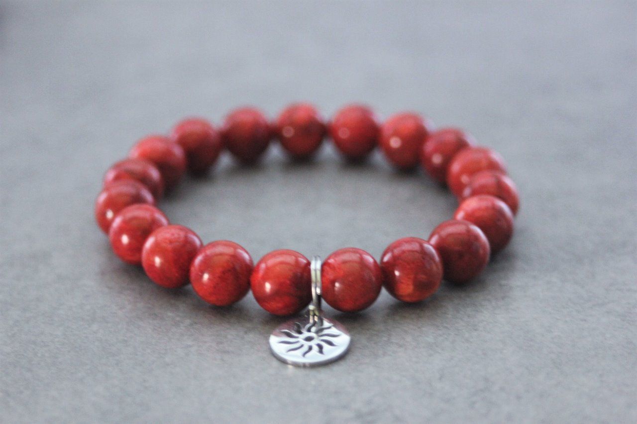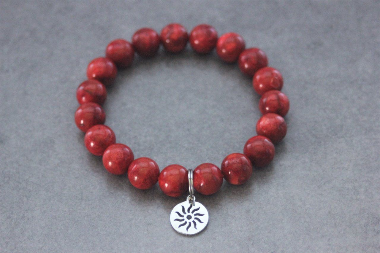 Bracelet perles corail rouge et breloque soleil en acier inoxydable - bracelet pierres naturelles - bracelet pierres gemmes - bracelet mixte