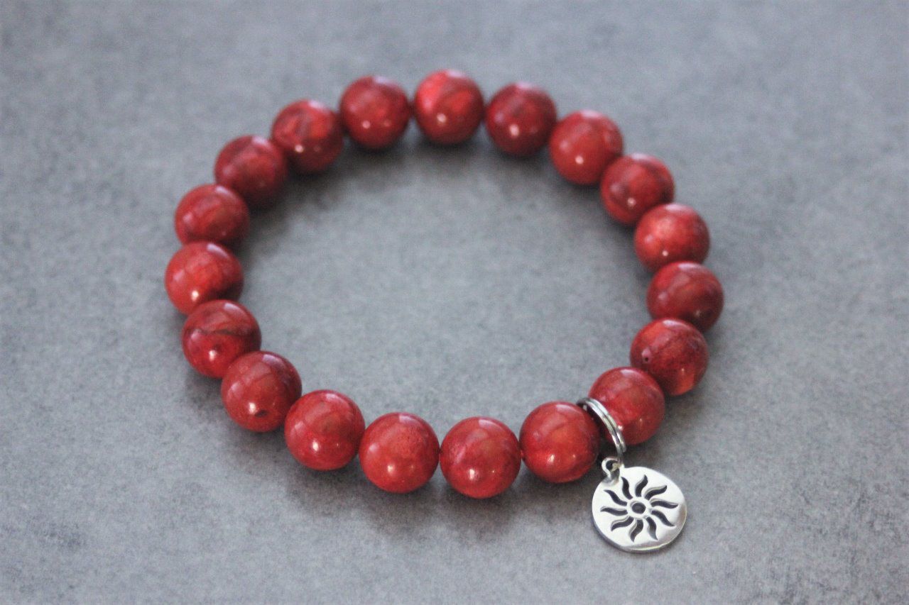 Bracelet perles corail rouge et breloque soleil en acier inoxydable