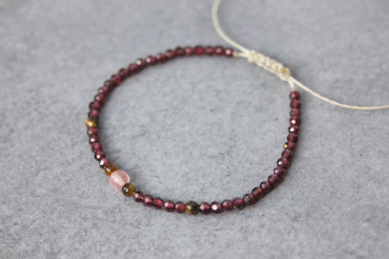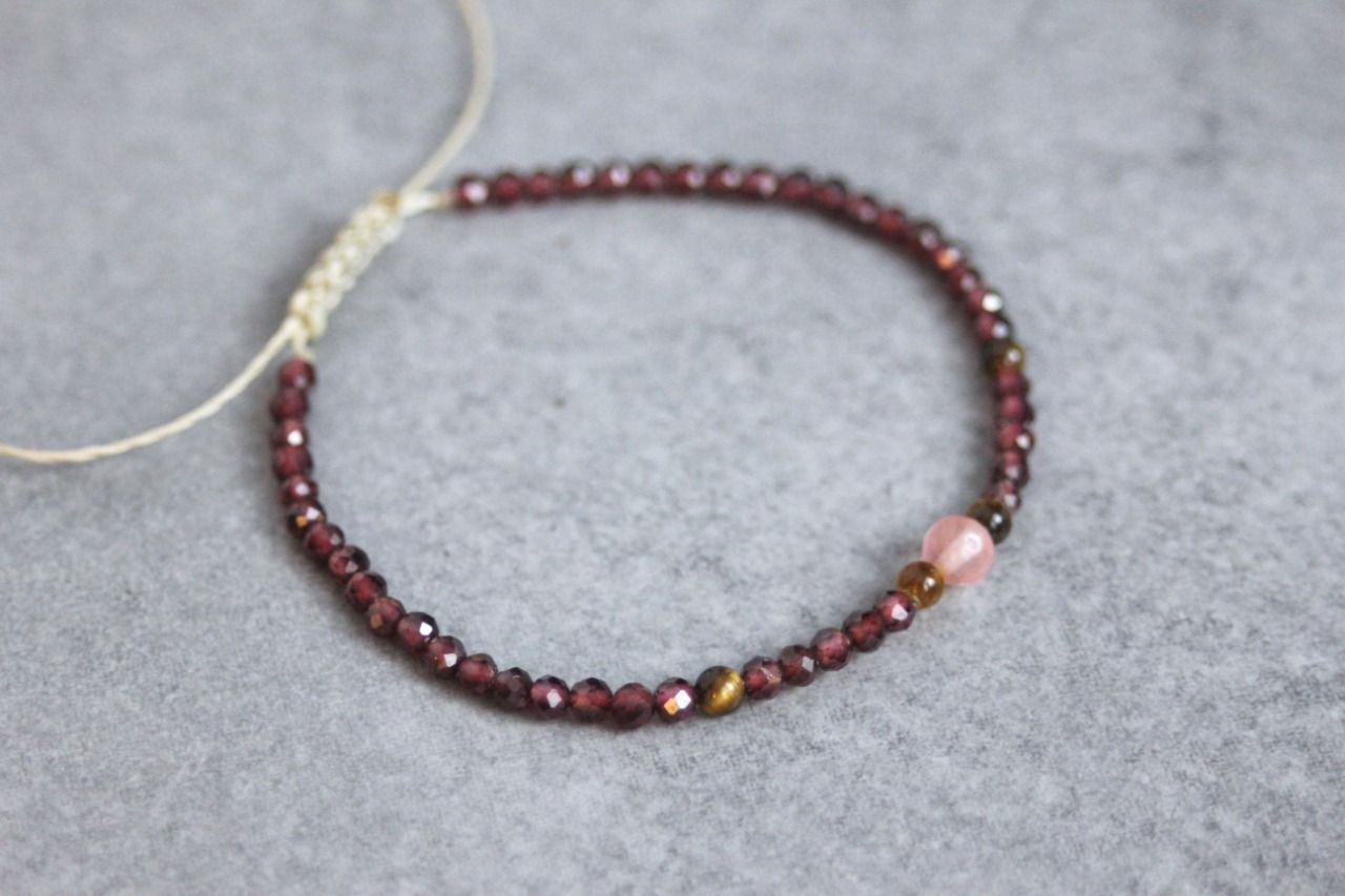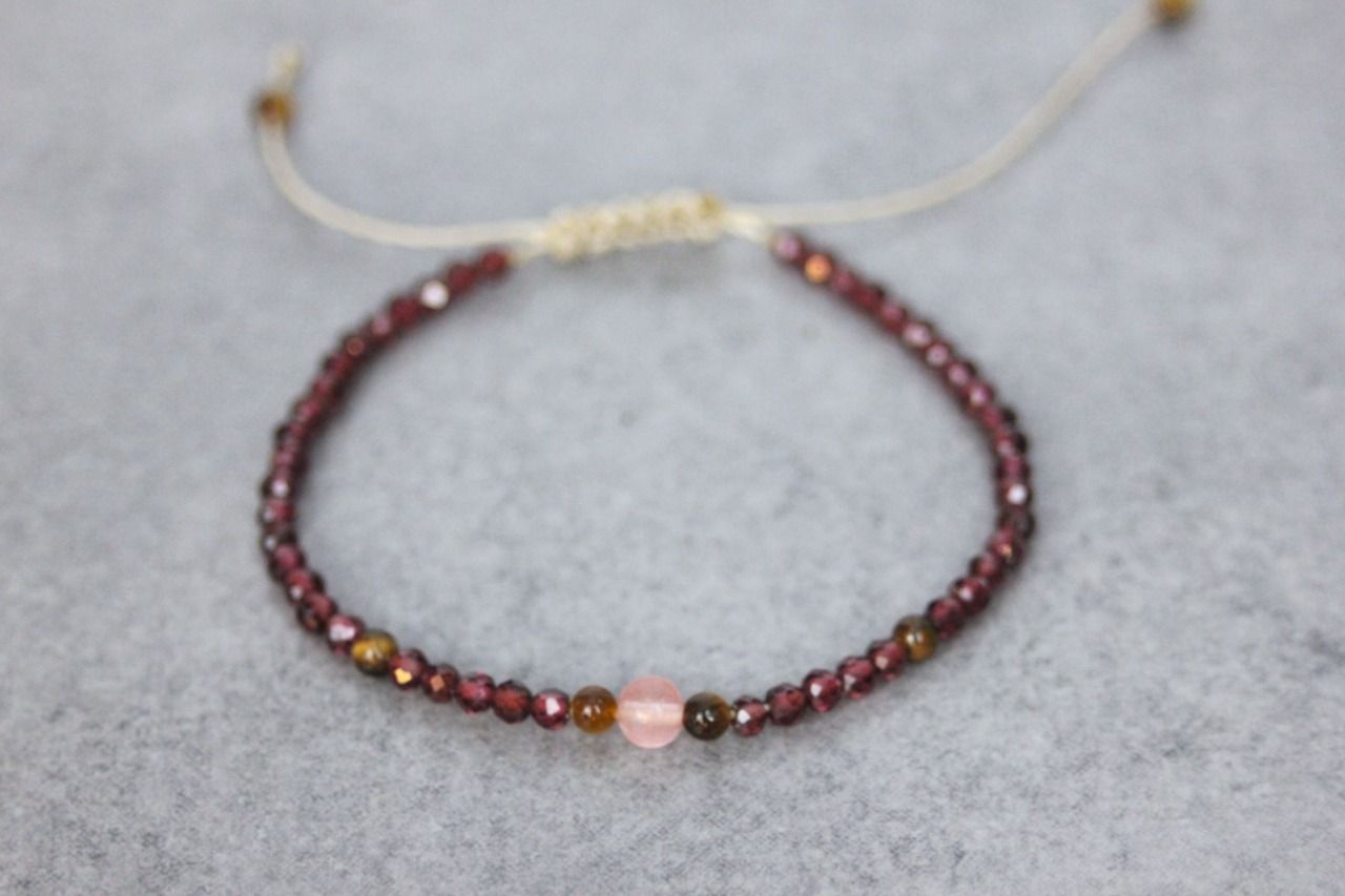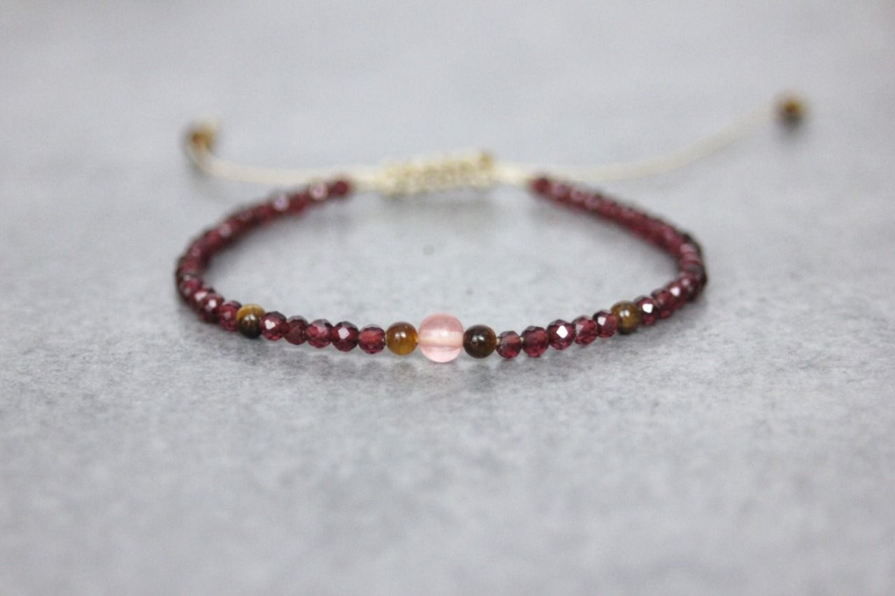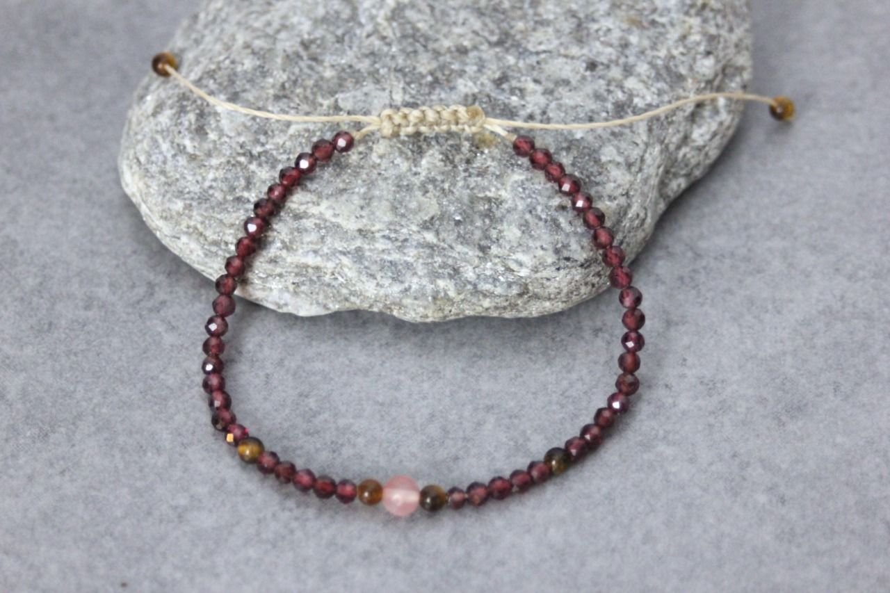 Bracelet perles en pierres naturelles grenat, oeil de tigre et quartz rose - bracelet femme en pierres naturelles - bracelet cordon