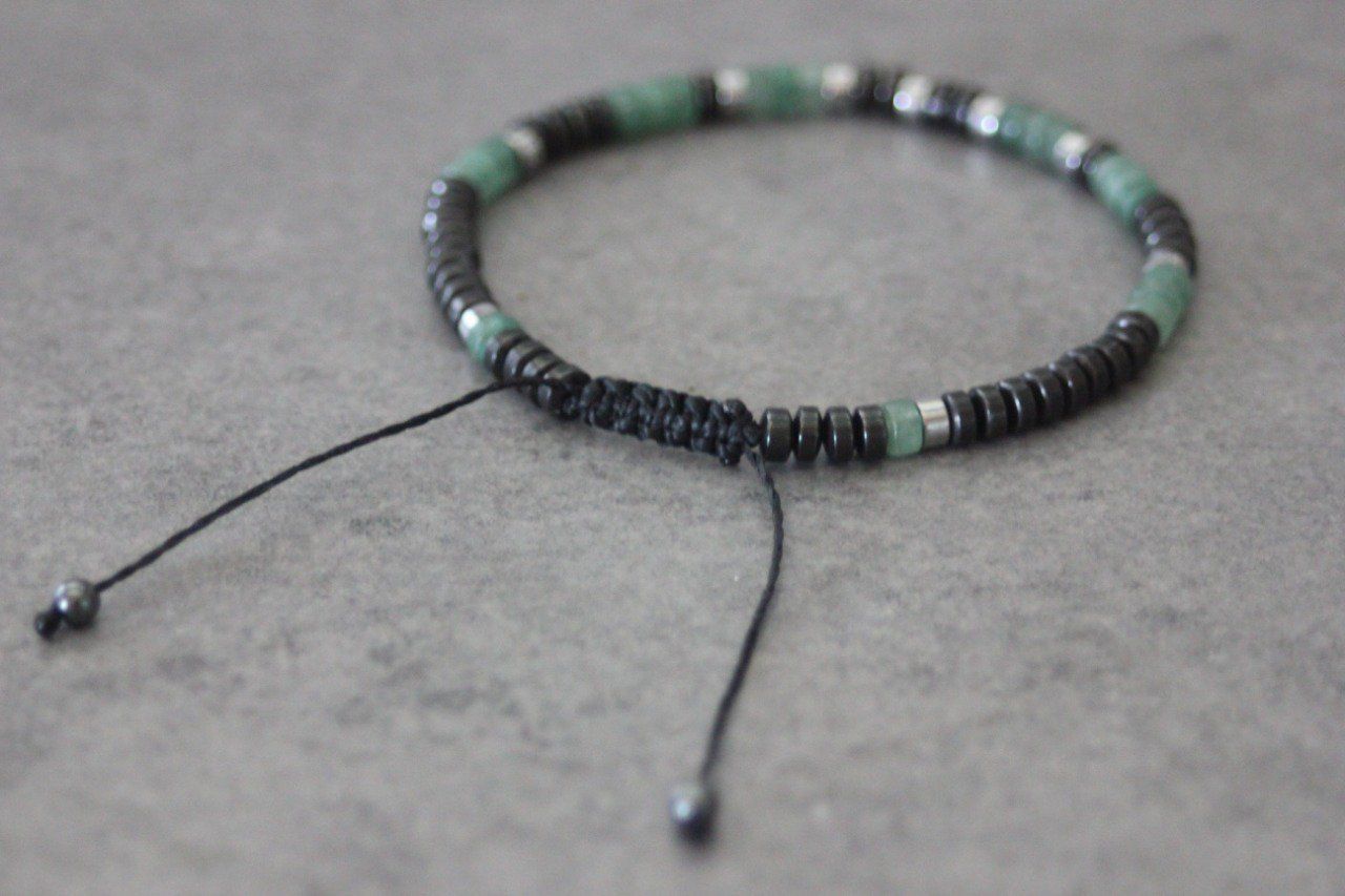 Bracelet en pierres naturelles semi-précieuses. Matériaux utilisés : perles heishi aventurine émeraude, hématite et hématite argentée. Fermoir coulissant (convient à tous les poignets)