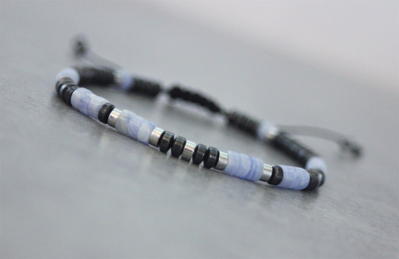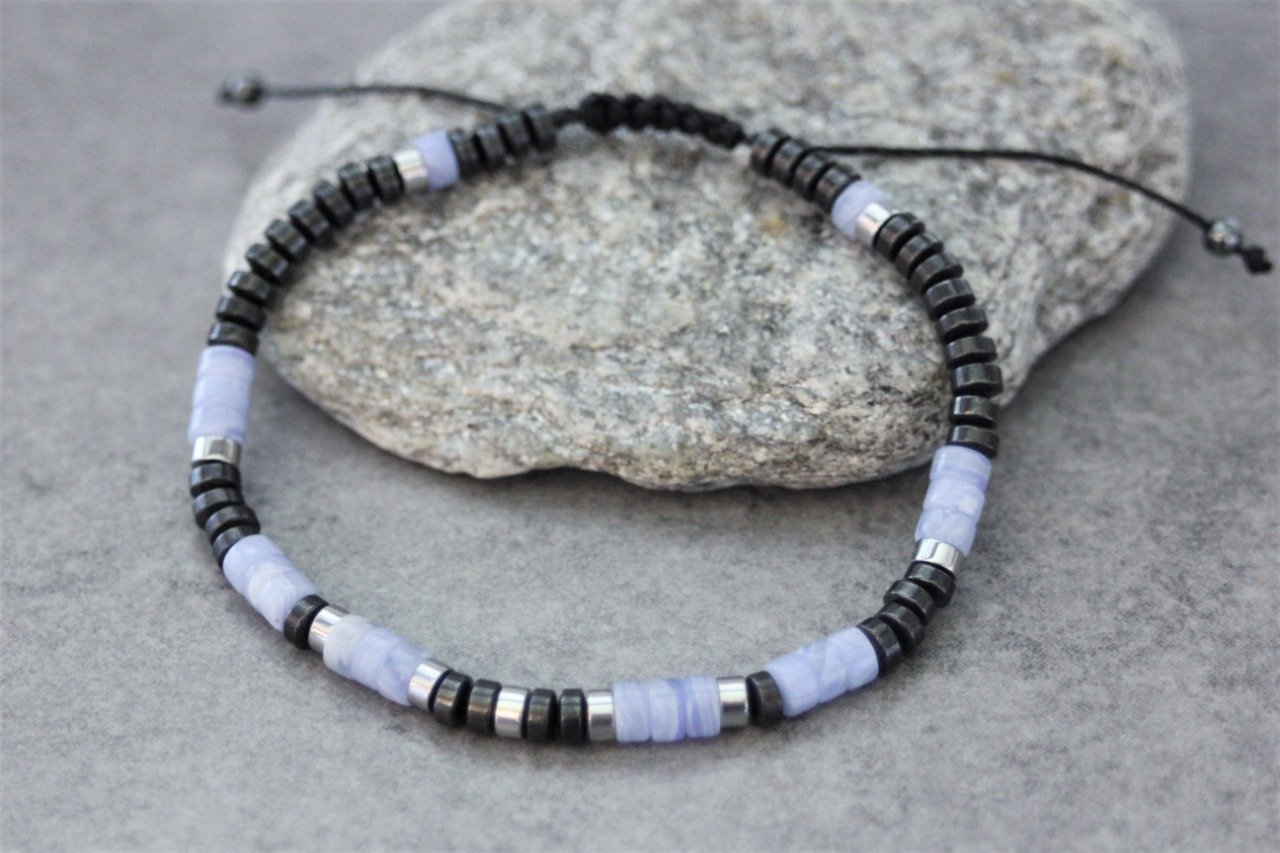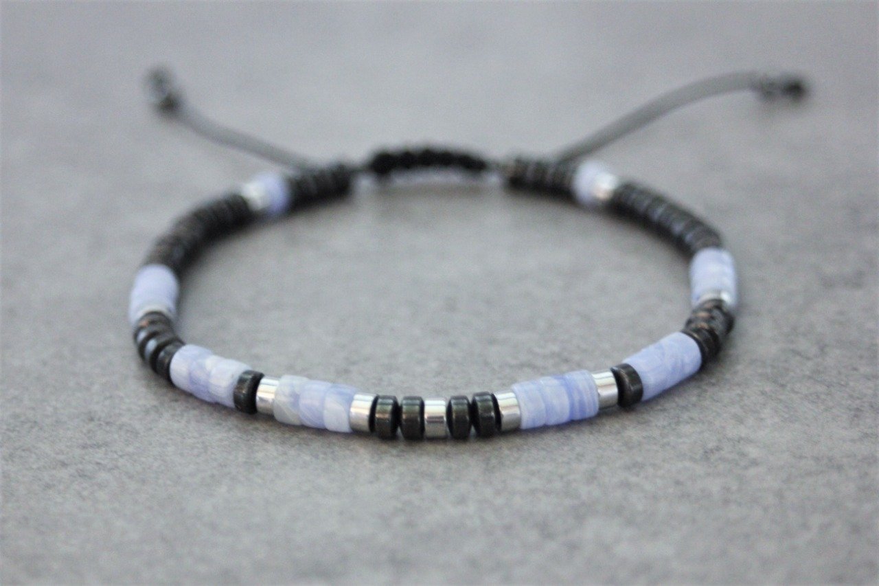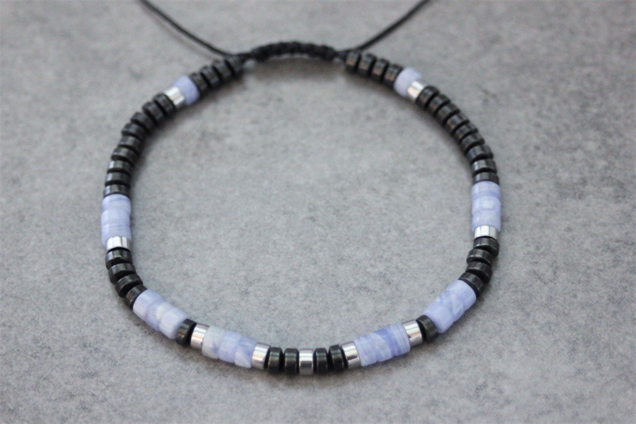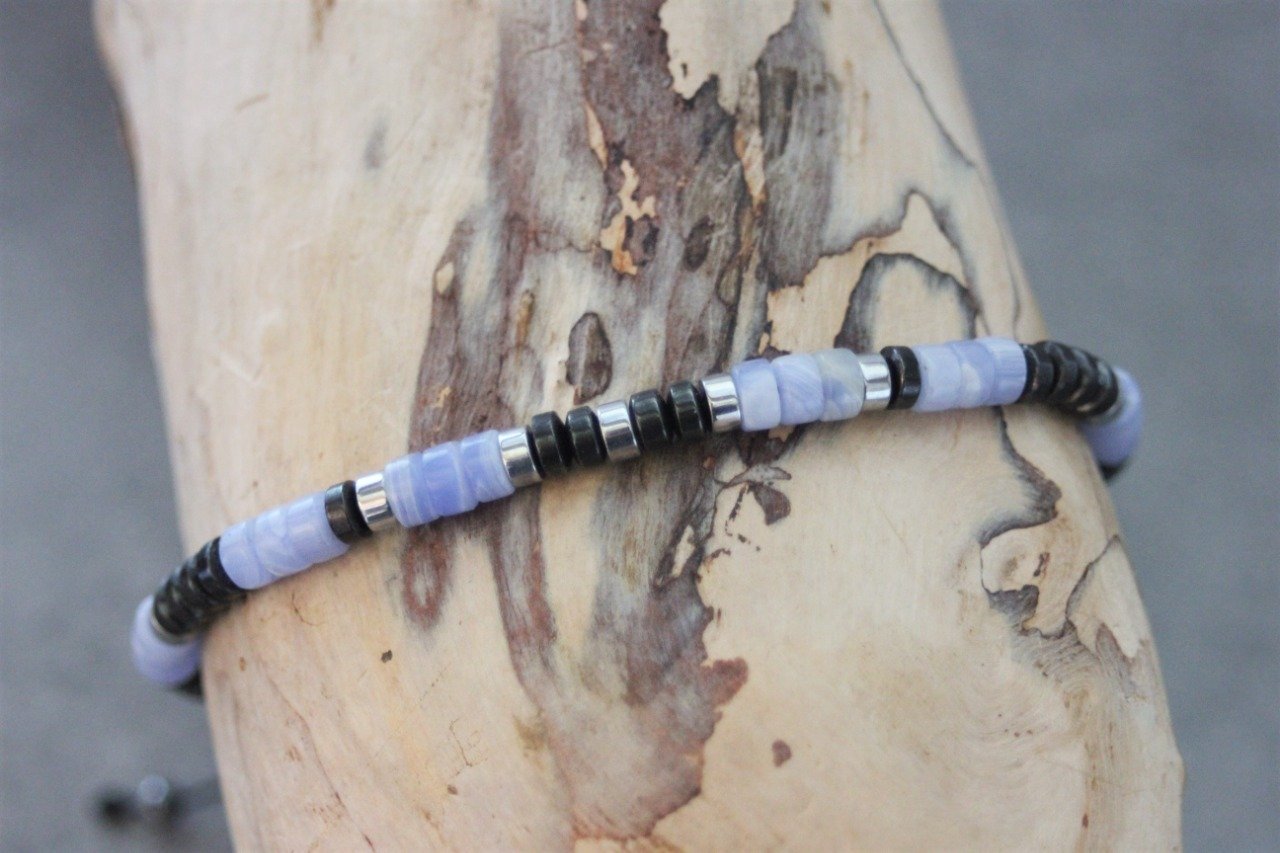Bracelet en pierres naturelles semi-précieuses. Matériaux utilisés : perles heishi calcédoine, hématite et hématite argentée. Fermoir coulissant (convient à tous les poignets)