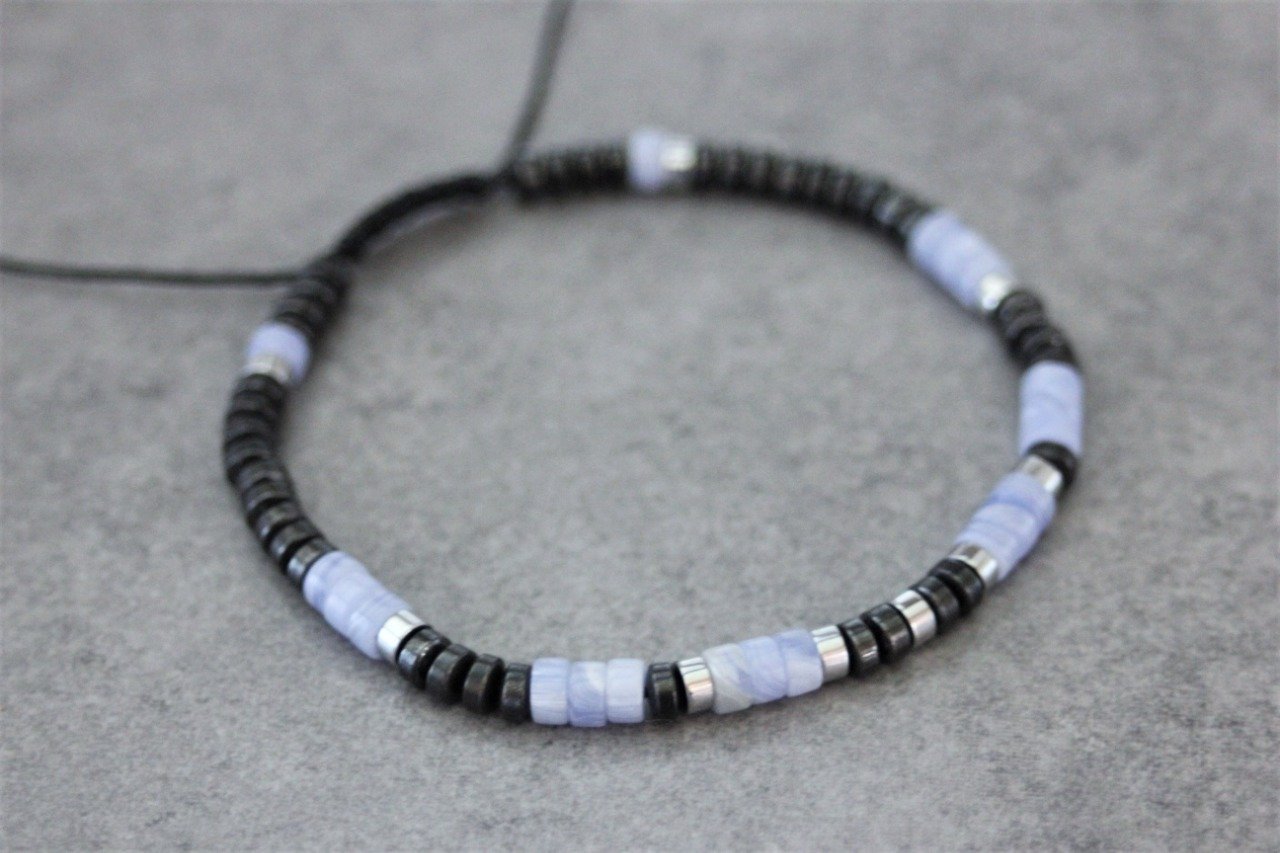 Bracelet homme perles heishi en calcédoine, hématite et hématite argenté Ø4mm - bracelet pierres naturelles - bracelet pierres gemmes - Bracelet surfeur