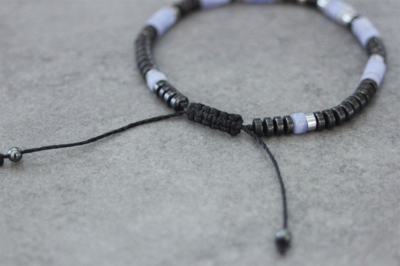 Bracelet ajustable avec fermoir coulissant de type macramé se terminant par 2 perles en hématite de 3mm.