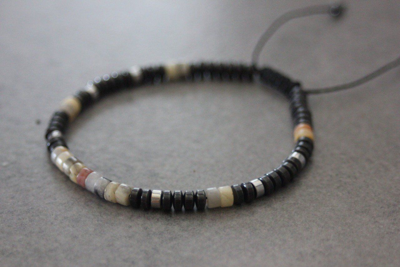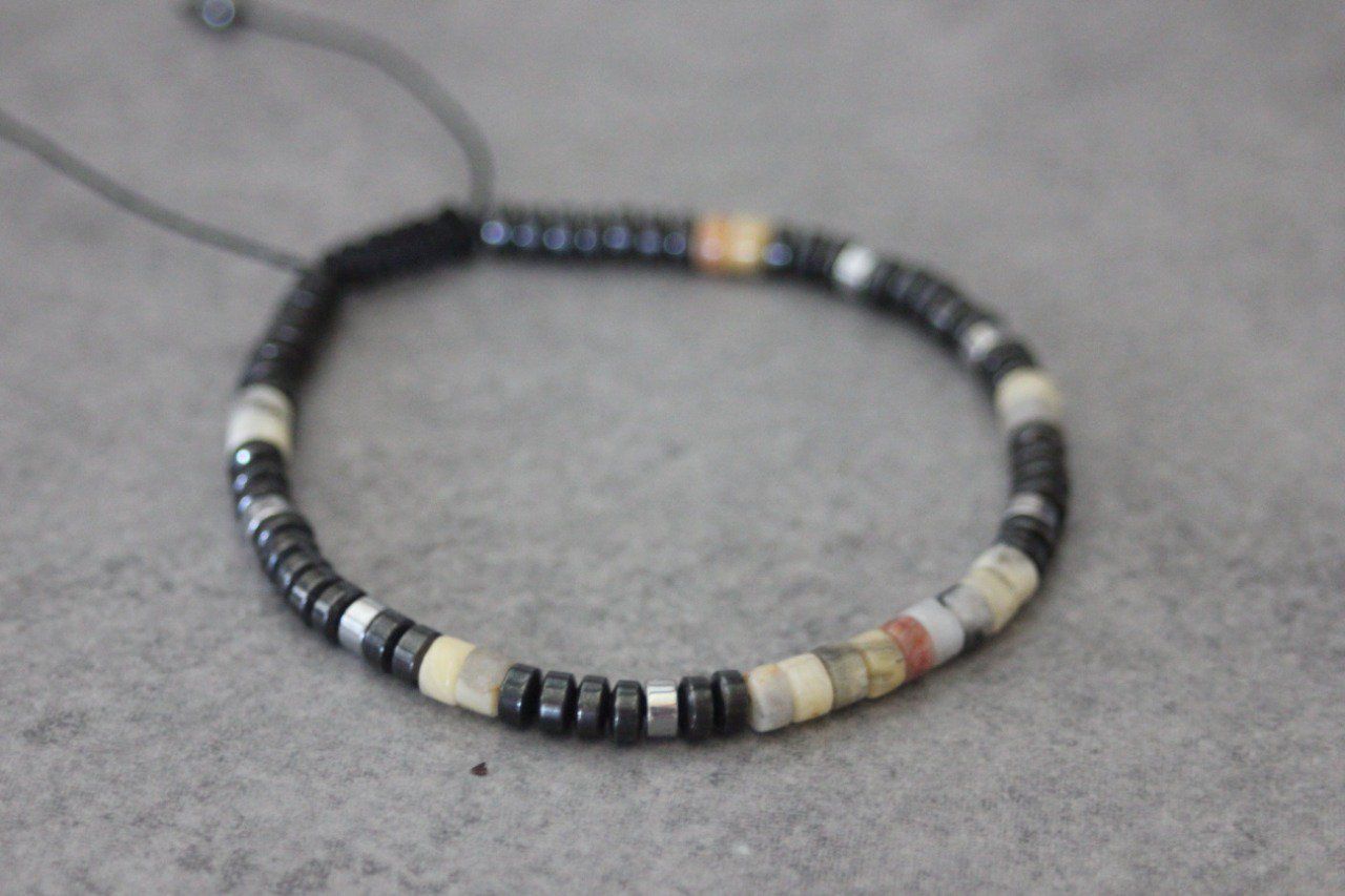Bracelet en pierres naturelles semi-précieuses. Matériaux utilisés : perles heishi crazy agate, hématite et hématite argentée. Fermoir coulissant (convient à tous les poignets)