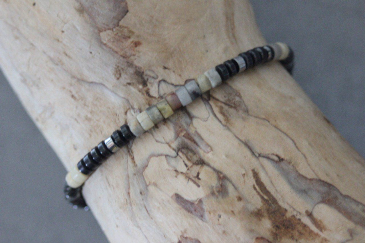 Bracelet homme perles heishi en crazy agate, hématite et hématite argenté Ø4mm - bracelet pierres naturelles - bracelet pierres gemmes - Bracelet surfeur