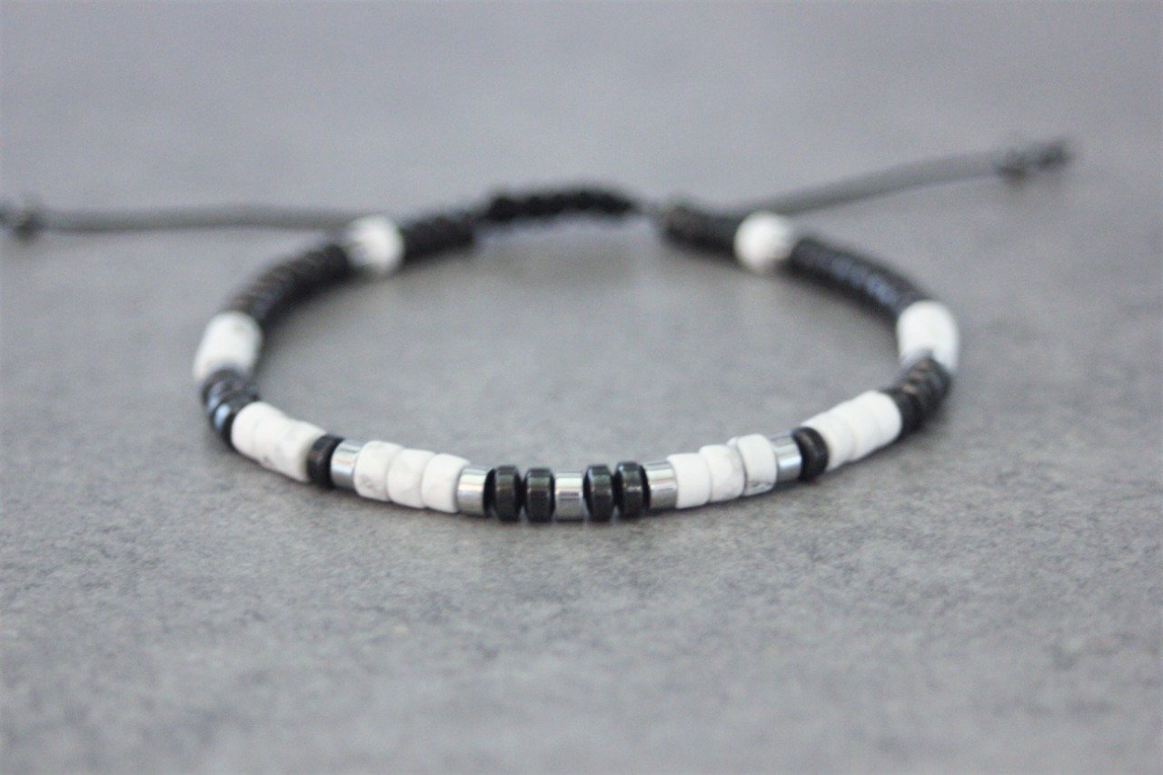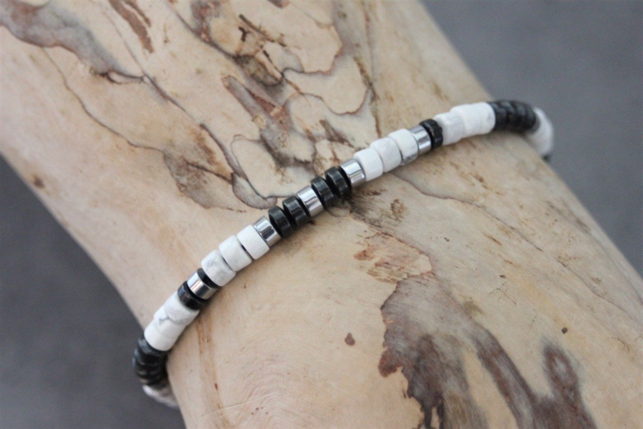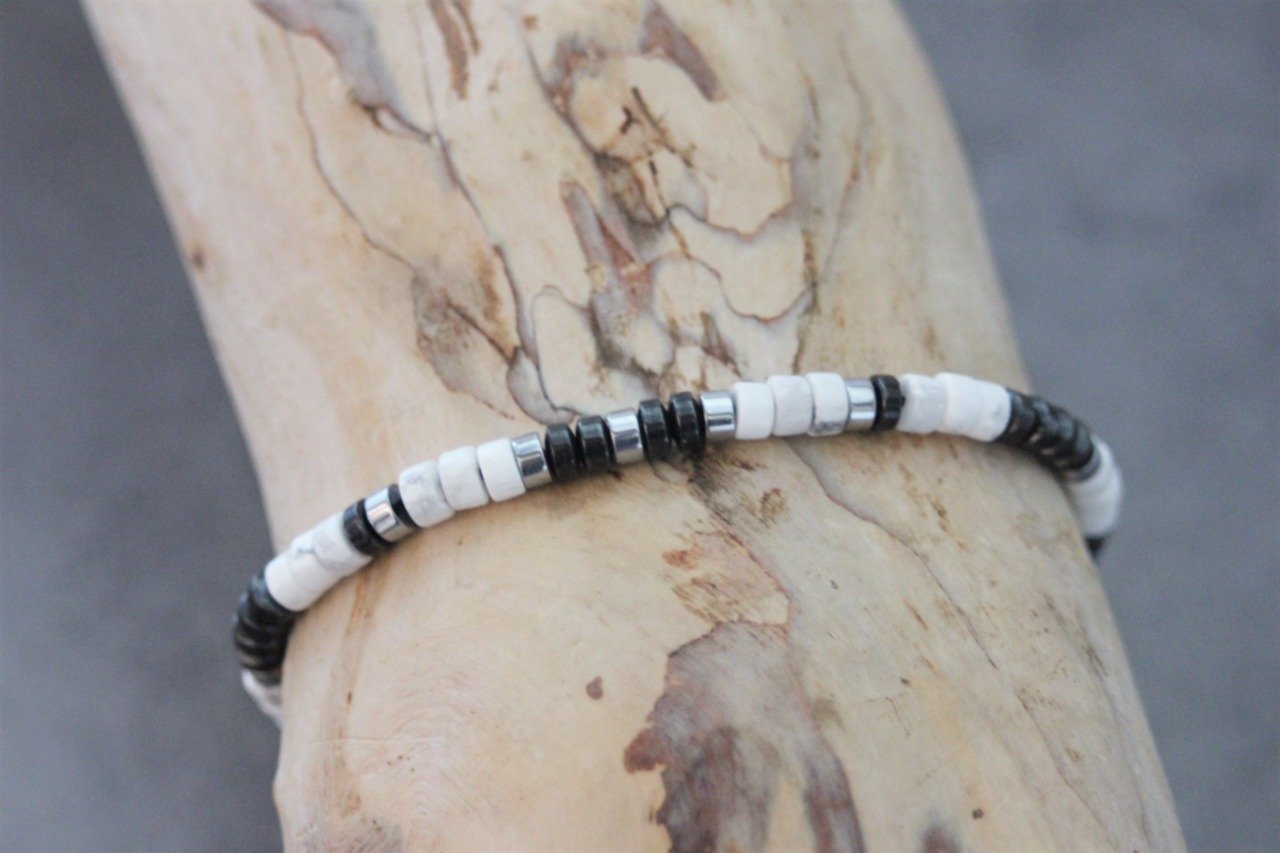 Bracelet homme perles heishi en howlite blanche, hématite et hématite argenté Ø4mm - bracelet pierres naturelles - bracelet pierres gemmes - Bracelet surfeur