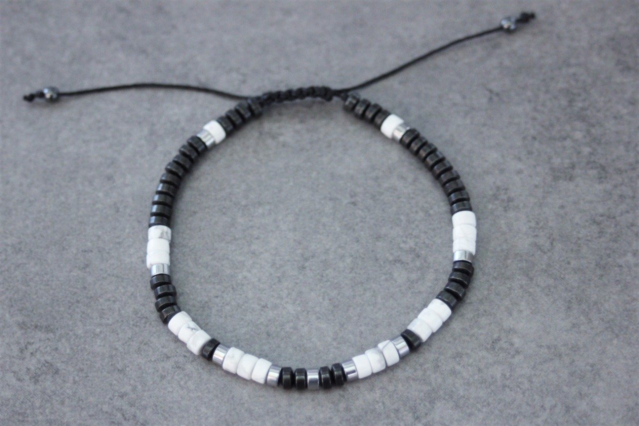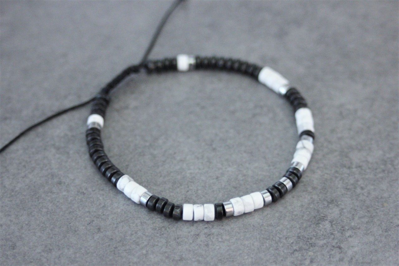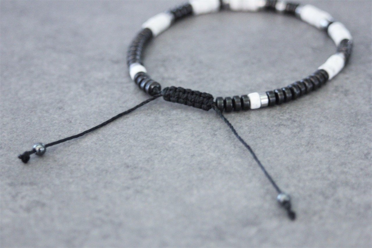 Bracelet en pierres naturelles semi-précieuses. Matériaux utilisés : perles heishi howlite blanche, hématite et hématite argentée. Fermoir coulissant (convient à tous les poignets)