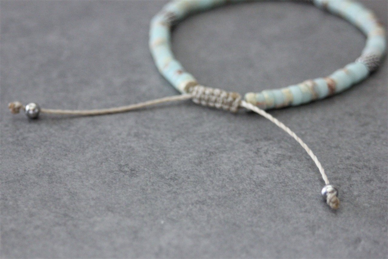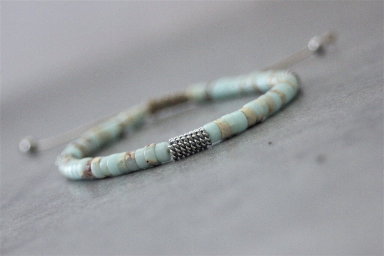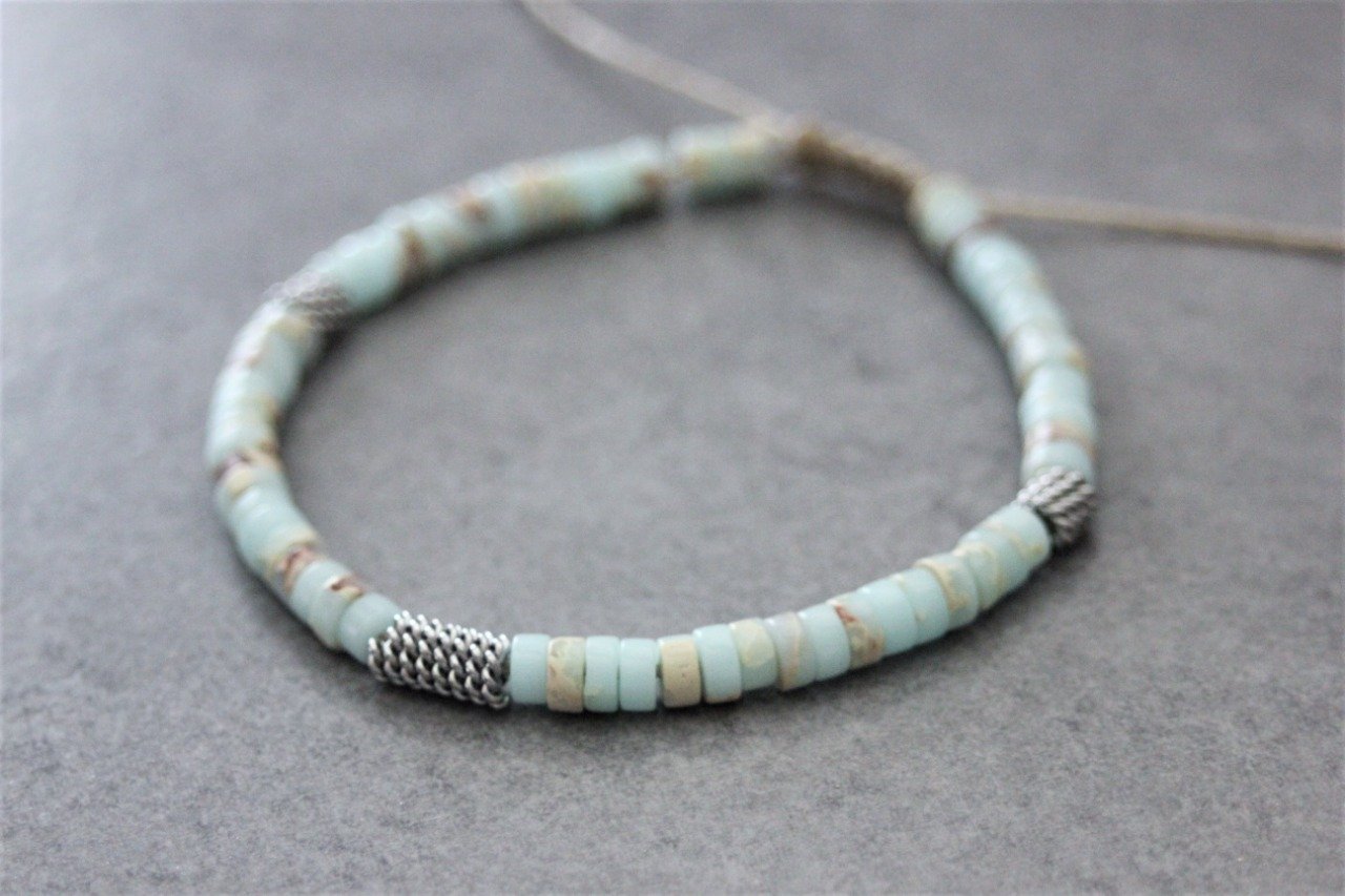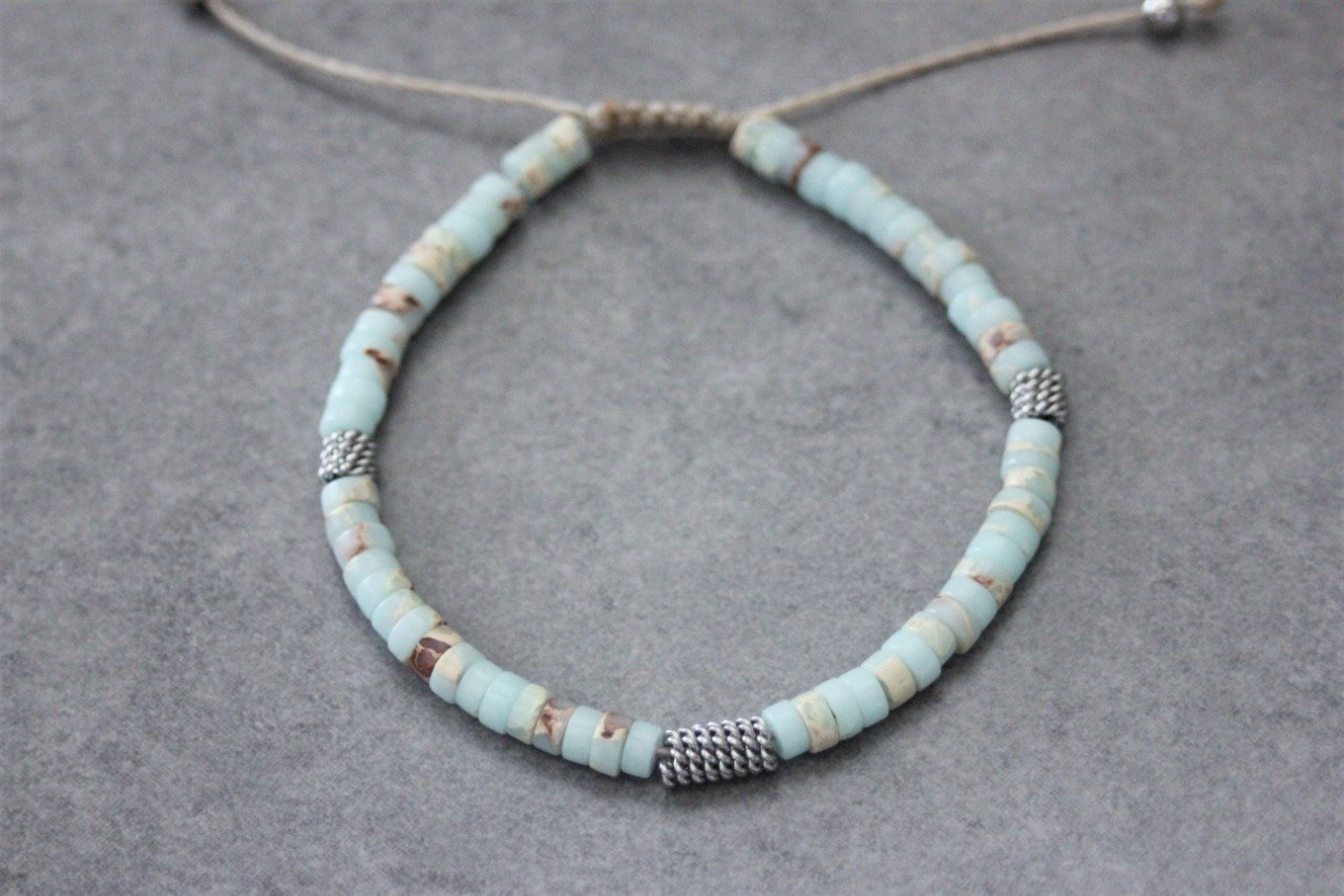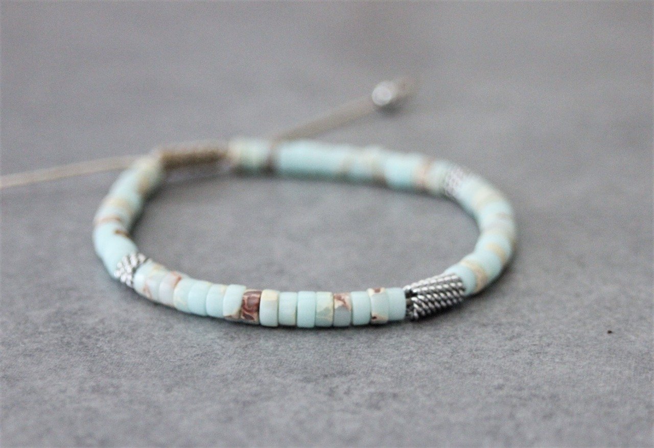 Bracelet en pierres naturelles semi-précieuses. Matériaux utilisés : perles heishis jaspe impérial et perles stubes style barbelé en acier inoxydable. Fermoir coulissant (convient à tous les poignets)