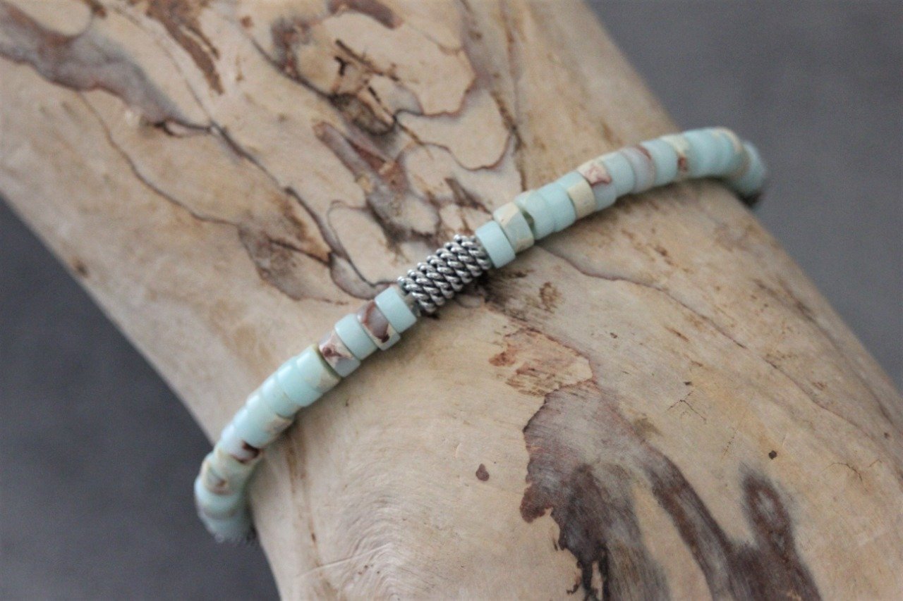 Bracelet homme perles heishi en jaspe impérial, et perles tubes style barbelé en acier inoxydable Ø4mm - bracelet pierres naturelles - bracelet pierres gemmes - Bracelet surfeur