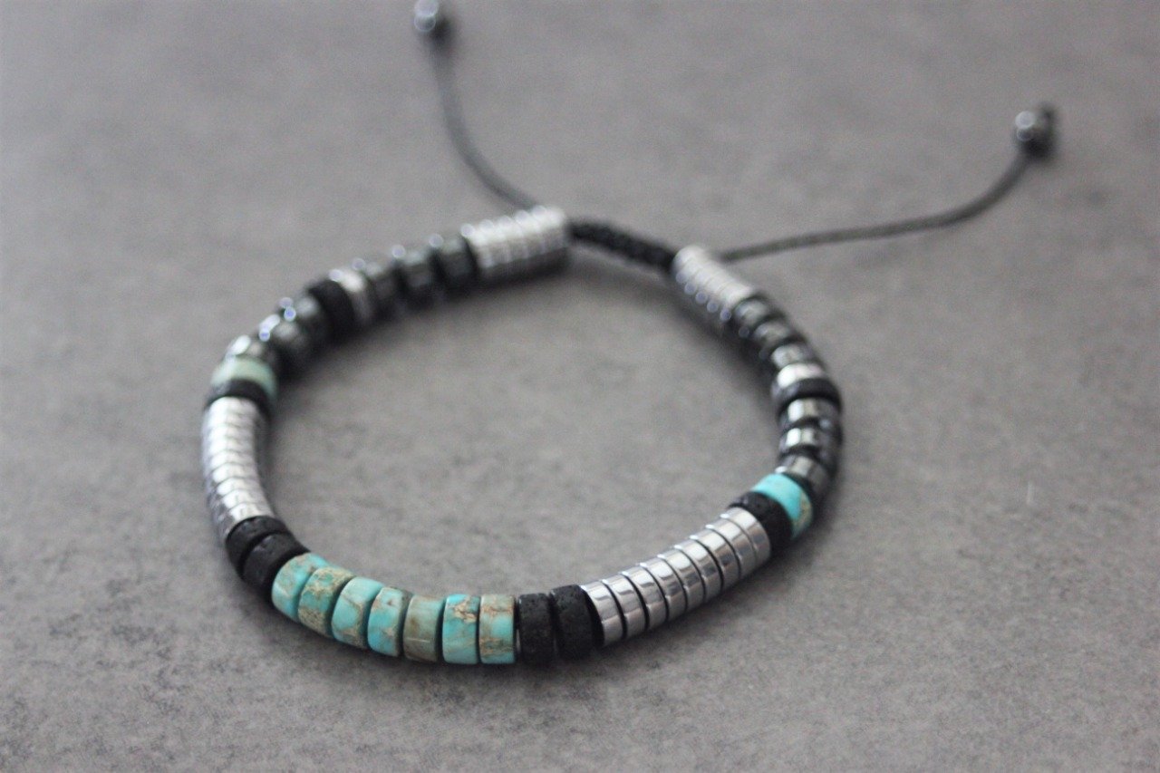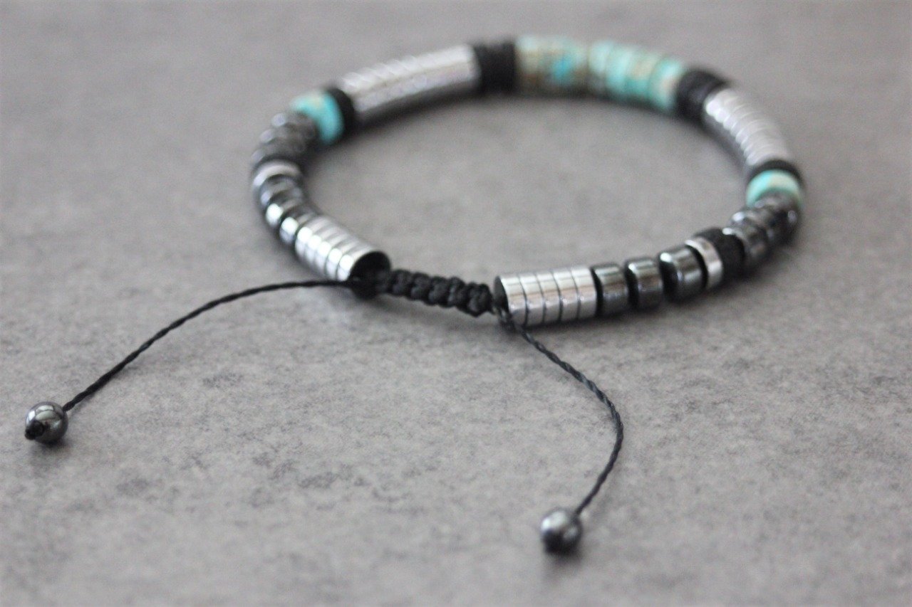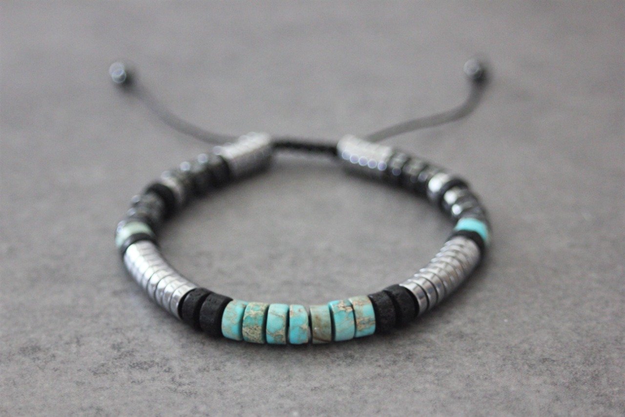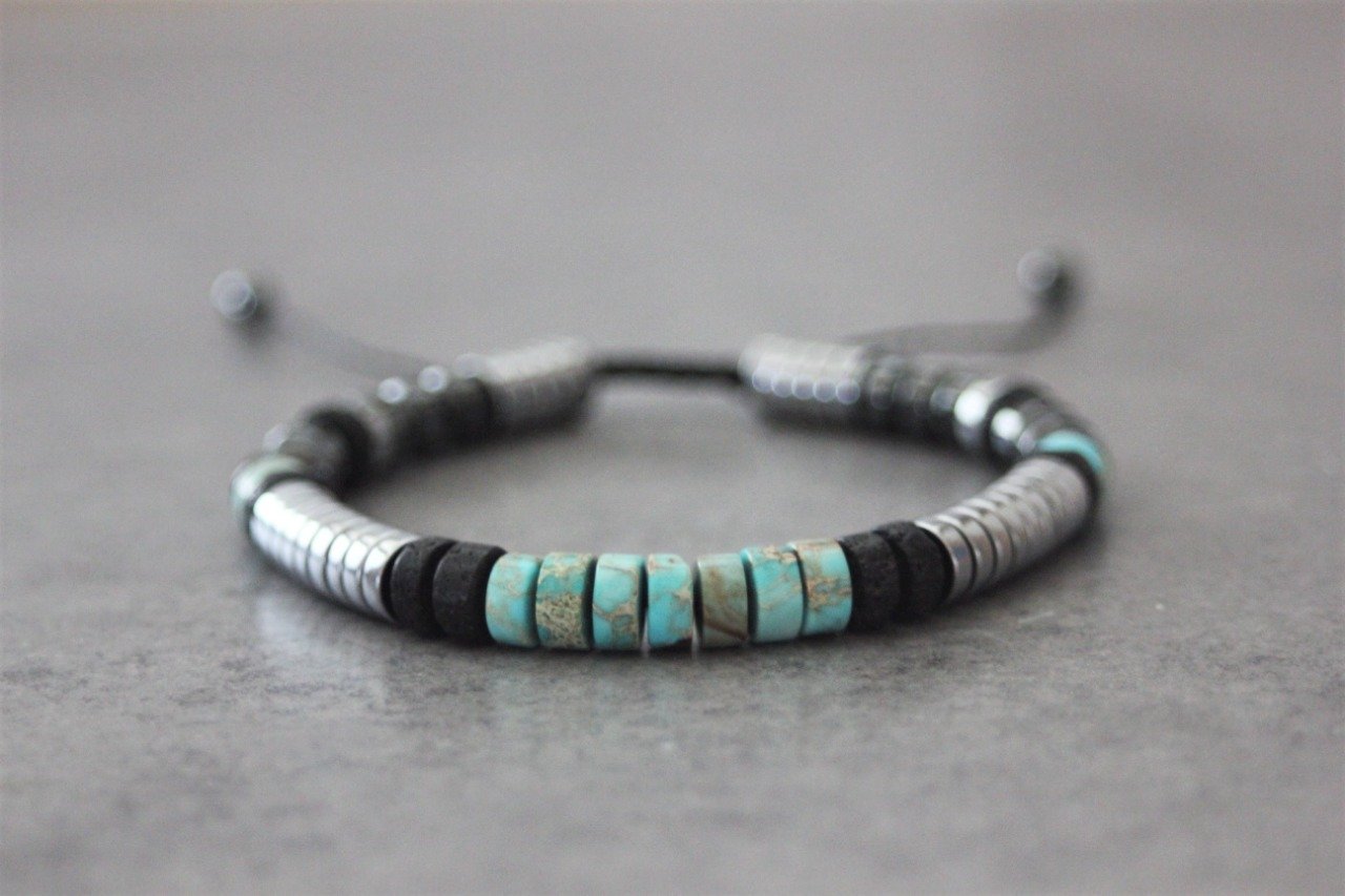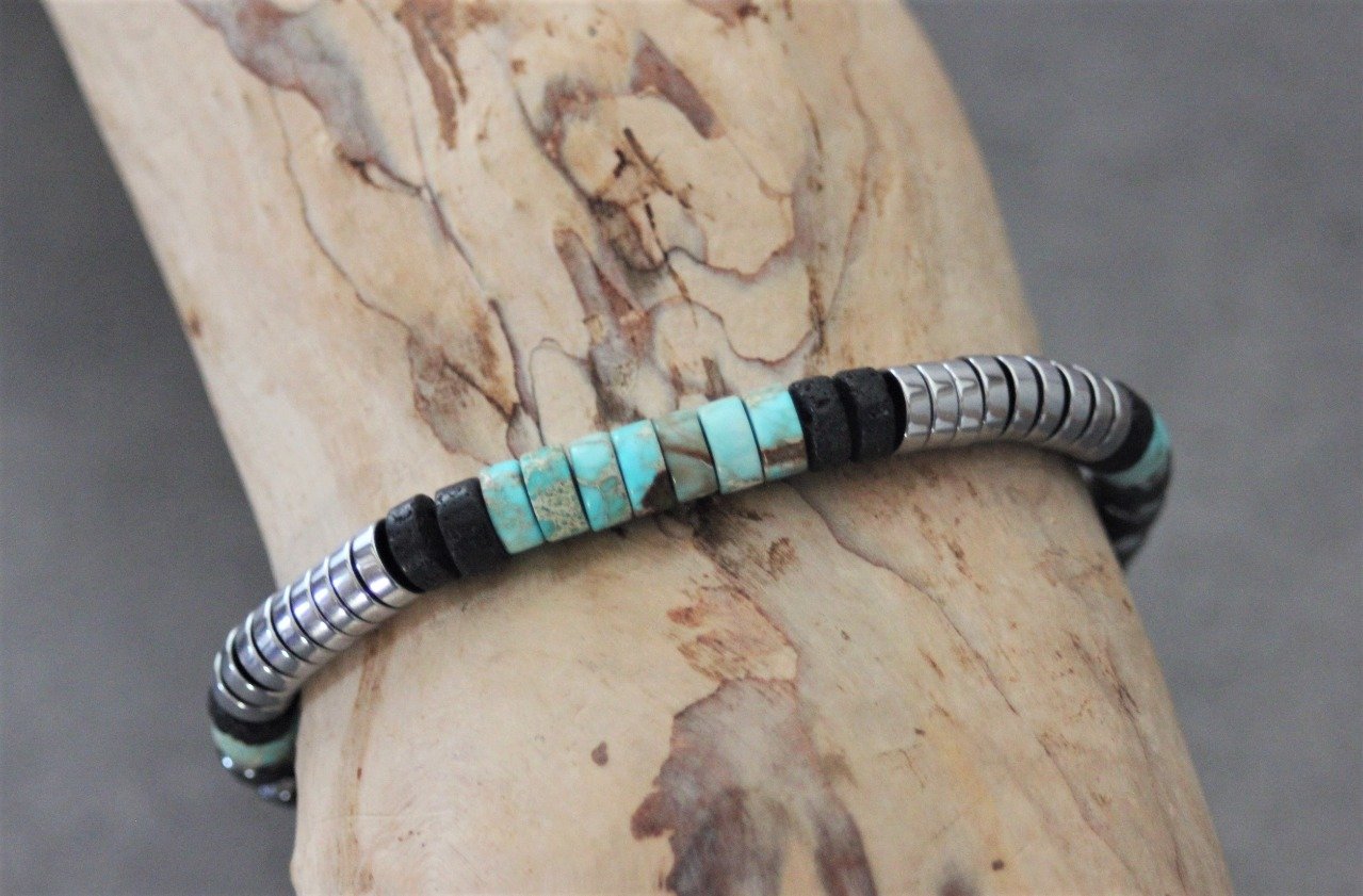 Bracelet homme perles heishi en jaspe impérial, pierre de lave, hématite et hématite argenté Ø6mm - bracelet pierres naturelles - bracelet pierres gemmes - Bracelet surfeur