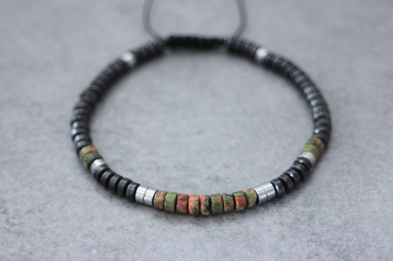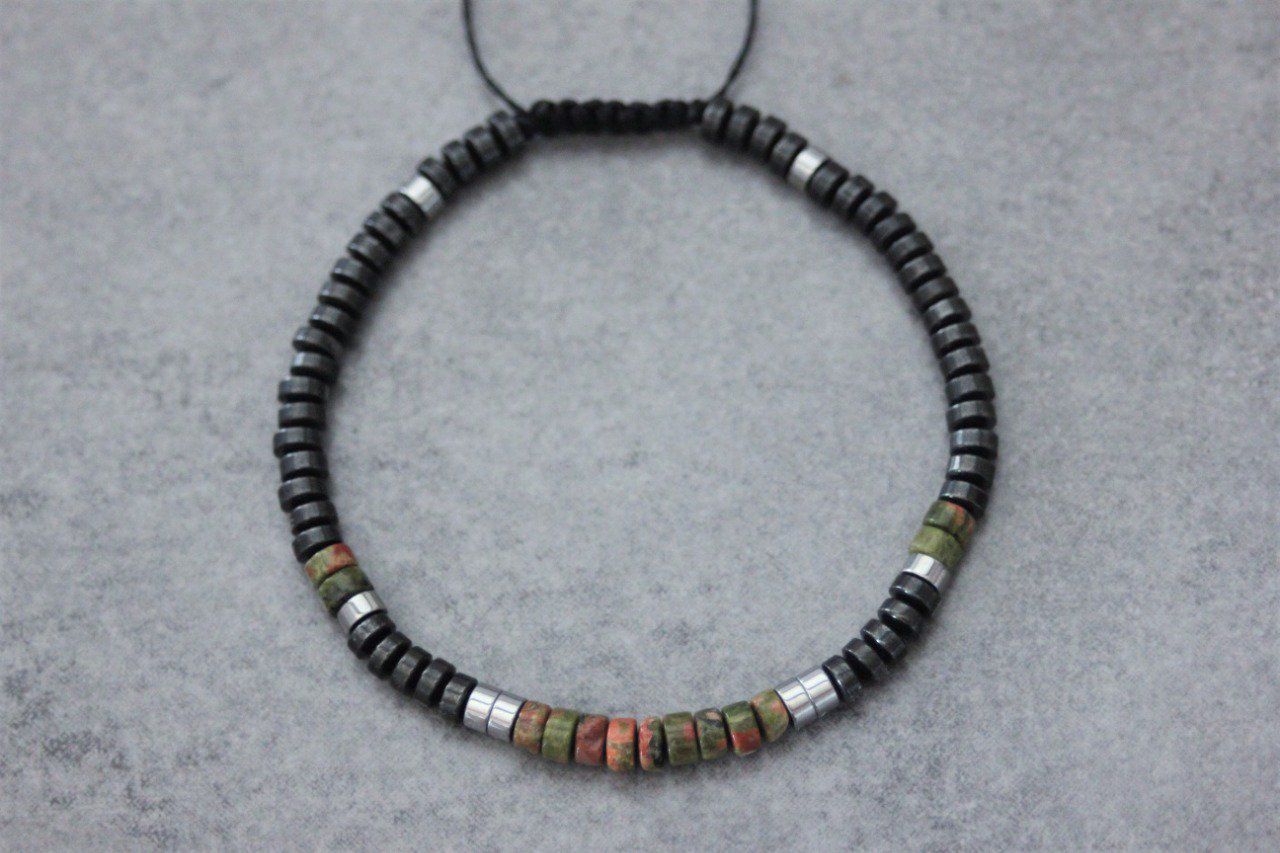 Bracelet en pierres naturelles semi-précieuses. Matériaux utilisés : perles heishi unakite, hématite et hématite argentée. Fermoir coulissant (convient à tous les poignets)