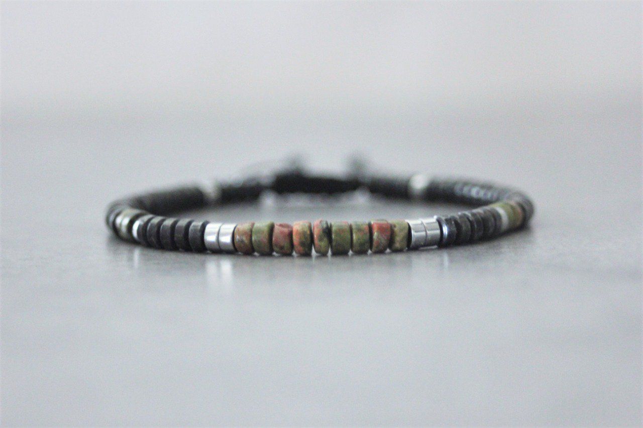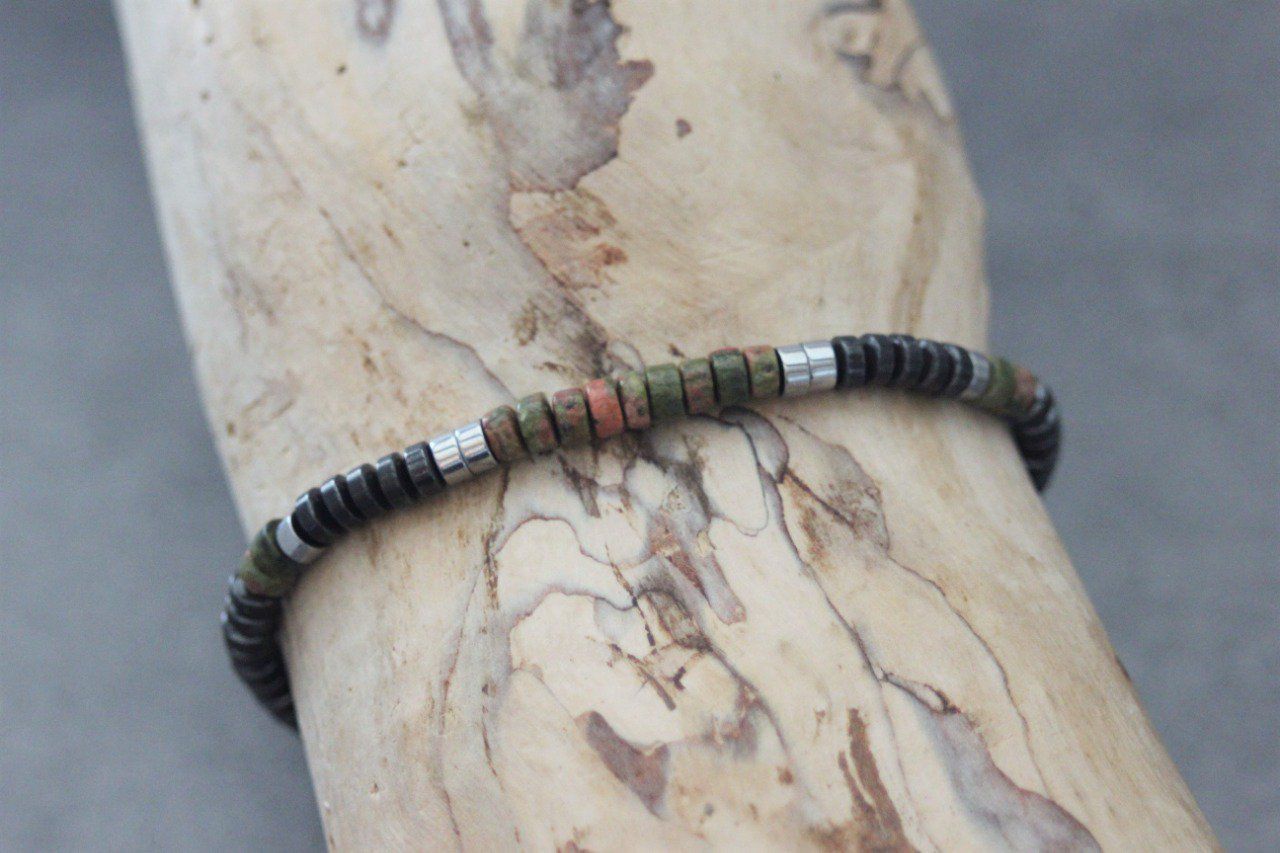 Bracelet homme perles heishi en unakite, hématite et hématite argenté Ø4mm - bracelet pierres naturelles - bracelet pierres gemmes - Bracelet surfeur