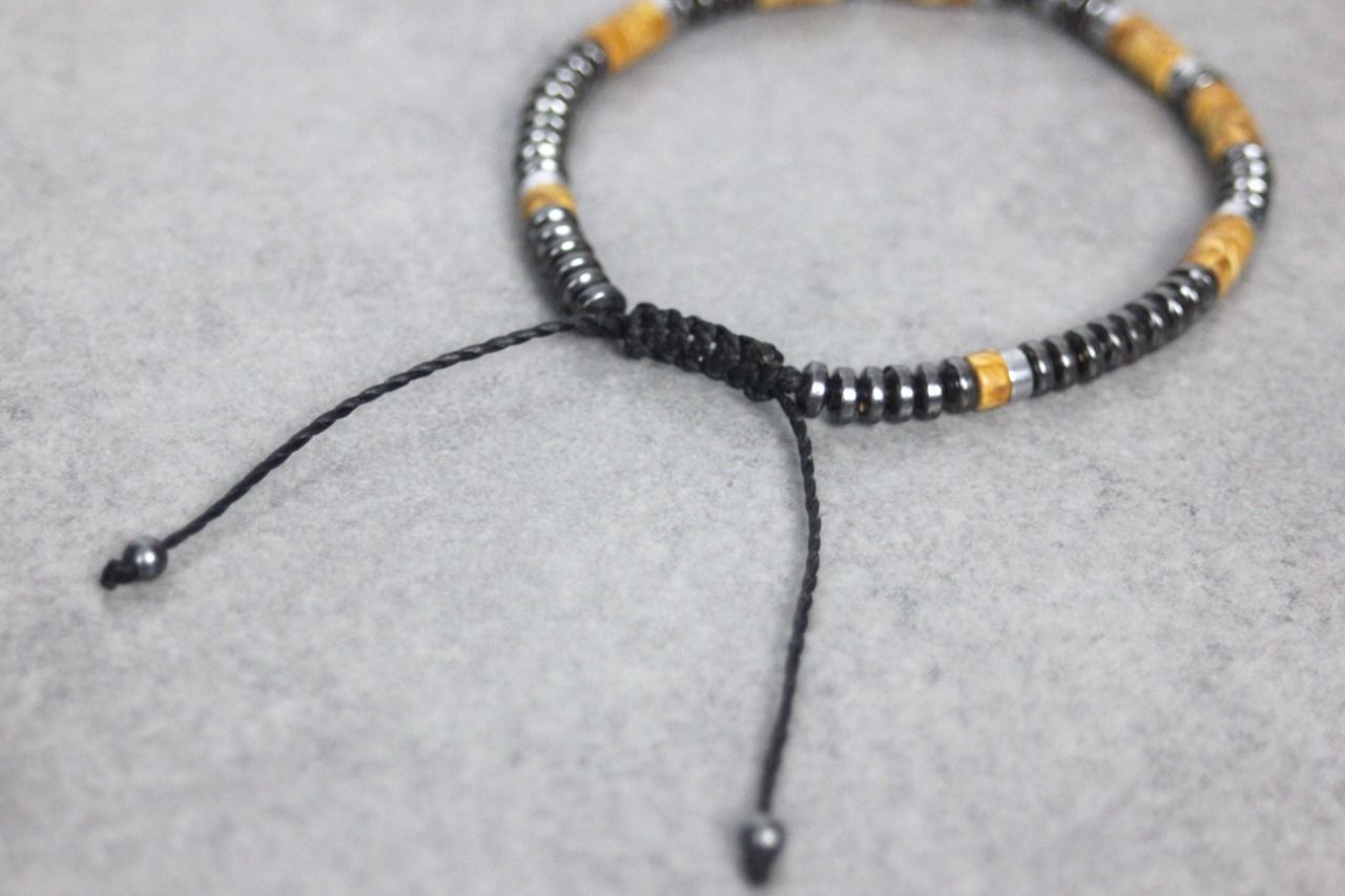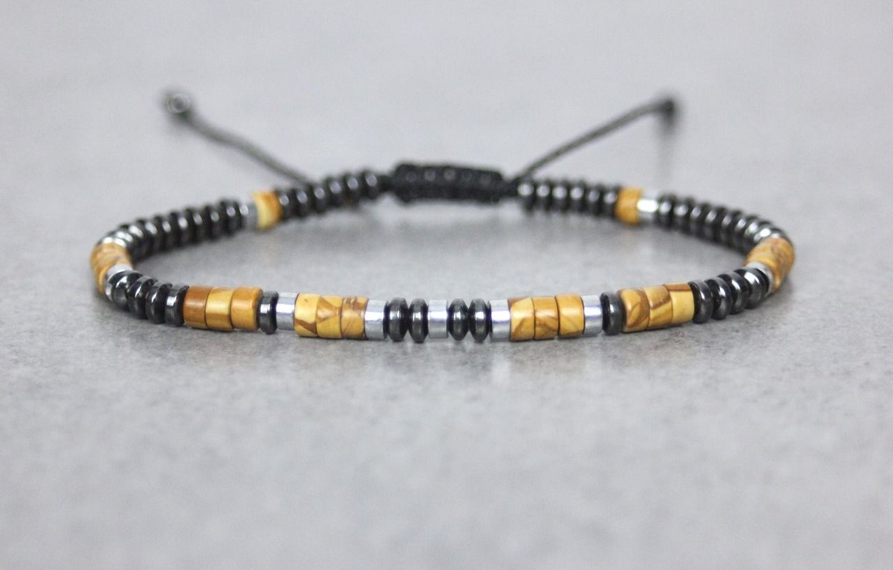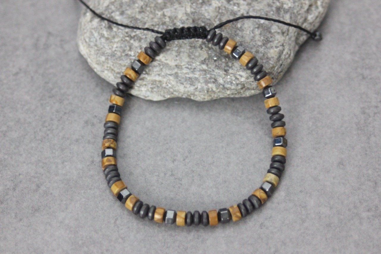 Bracelet en pierres naturelles semi-précieuses. Matériaux utilisés : perles heishi wood stone, hématite et hématite argentée. Fermoir coulissant (convient à tous les poignets)