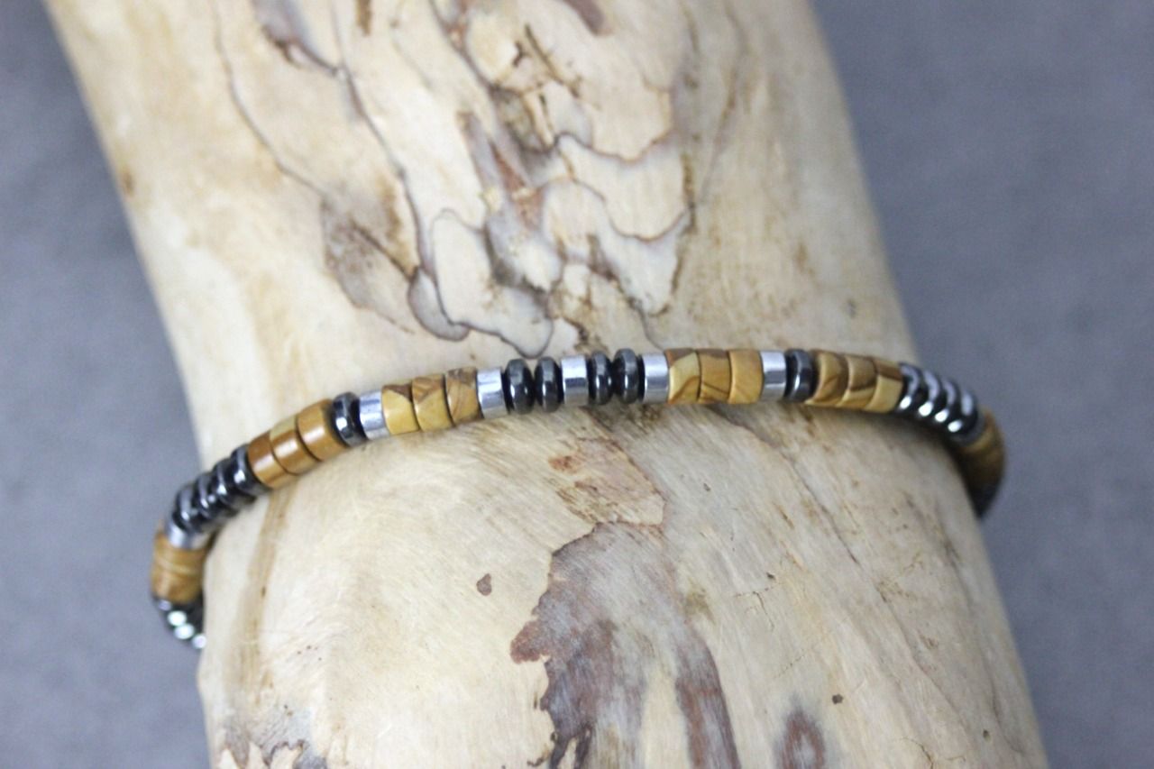 Bracelet homme perles heishi en wood stone, hématite et hématite argenté Ø4mm - bracelet pierres naturelles - bracelet pierres gemmes - Bracelet surfeur